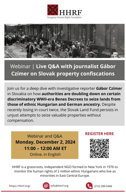 2024. novemberében és decemberében is egy-egy érdekfeszítő és informatív webináriumot szervezett a Magyar Emberi Jogok Alapítvány (HHRF). November 15-én az Ukrajnában élő magyar kisebbség helyzetéről és az ország EU-csatlakozásáról, december 2-án pedig a Beneš-dekrétumokról esett szó.