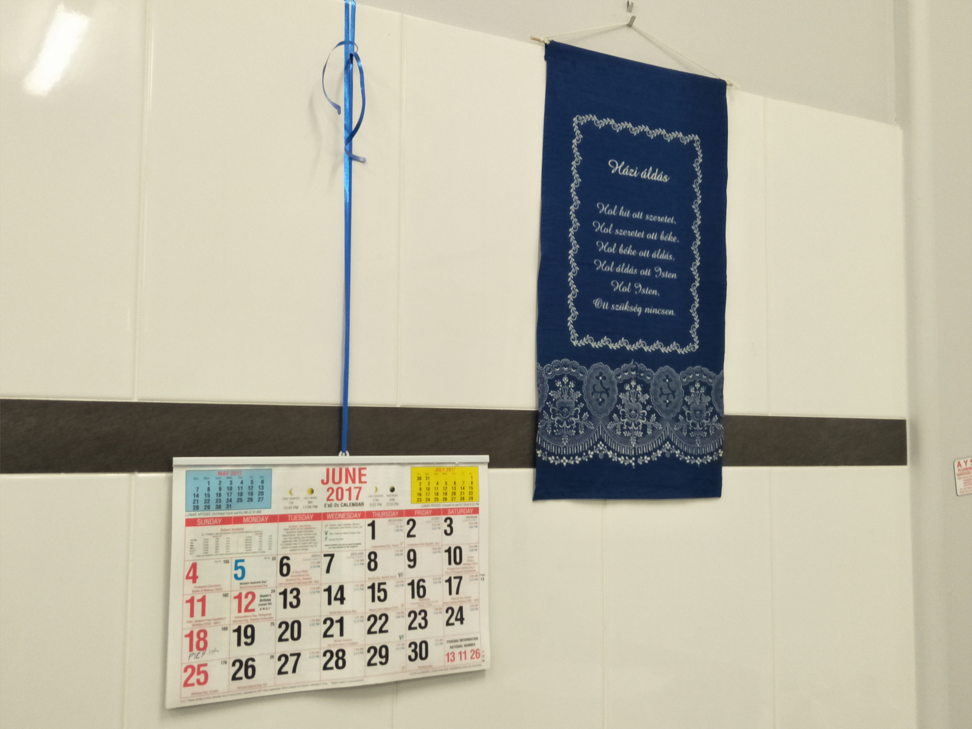 Sok fotót kapcsolhatnék ehhez az első íráshoz, de ezekből bizonyára lesz elég a klubot meglátogató többi ösztöndíjas beszámolóiban is, így inkább azt az egyet emelném ki, ami az imént idézett lényeget a legegyszerűbben illusztrálja. A klub konyhájának egyik falán egymás mellé akasztott idei falinaptárt és egy hagyományos magyar házi áldást ábrázoló fotó a folyamatosan múló kronologikus idő és a magyarságot megtartó egyetemes idő kapcsolatának szimbóluma számomra. Az áldás szövege így szól: „Hol hit, ott szeretet. Hol szeretet, ott béke. Hol béke, ott áldás. Hol áldás, ott Isten. Hol Isten, ott szükség nincsen”.