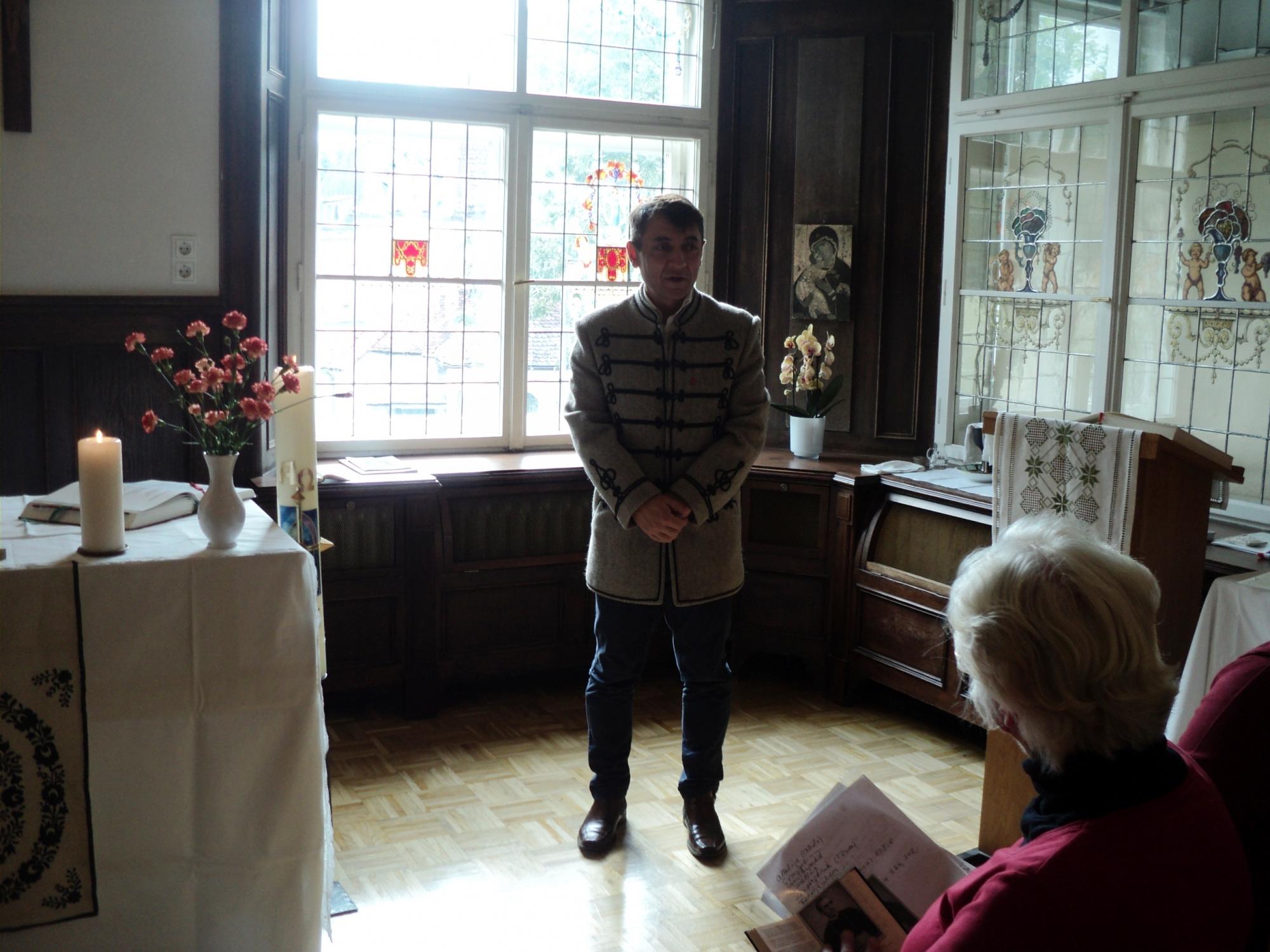 A kiállítás megnyitóján Ferenczes István Himnusz Márton Áron püspökhöz, valamint Dávid Erzsébet Láttam a püspököt című versének tolmácsolásával Wachsmuth Tünde, az Innsbrucki Magyar Római Katolikus Egyházközség világi elnöke működött közre, és szintén részét képezte a műsornak a jelenlévők többszöri közös éneklése, amelyet Vencser László és Nagy-György Attila vezetett. Magyarok Nagyasszonyának ünnepe lévén Mária-énekek hangzottak el: a Boldogasszony anyánk és az Isten hazánkért címűek, a műsor végén pedig a magyar és a székely himnusz. Az estet Kőrösi Csoma Sándor-ösztöndíjasként e sorok írója vezette. Megható volt látni, hogy velünk tartott és mindvégig jelen volt a német anyanyelvű Sebastian Wachsmuth, Tünde elnök asszony férje, valamint a magyar közösség lelki vezetésével megbízott dr. Hirschberger Raimund nős diakónus is kedves feleségével.