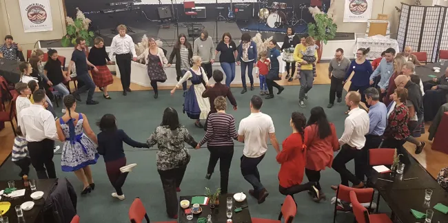 Ezt követte a Nebuló és a Csárdás táncegyüttes táncelőadása. Az eseményre kint tartózkodásunk óta készültünk a táncosokkal, így nagy izgalommal várta mindenki a produkciót. A műsort a gyerekek nyitották somogyi ugrós dalokkal, melynek szövegét kivetítettük, hogy a közönség is bekapcsolódhasson egy közös nagy éneklésbe. Ezt követte színtén a gyerekek somogyi ugrós és páros tánca, mely óriási sikert aratott a felnőttek körében. A harmadik szám apa-fia somogyi botos tánc volt, Attila és a 6 éves Ákos előadásában.