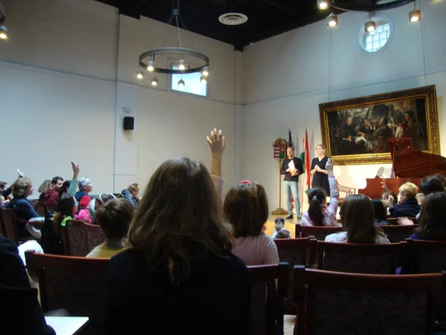 „Hunyd le a szemed! Na? Látod már?” Mi láttuk. Egy zongora, két tehetséges művész, és a Magyar Ház Díszterme egycsapásra megtelt a legkülönfélébb csodákkal. Láttunk óceánból előbukkanó hatalmas bálnát, ahogy vizet fúj egészen az égig, a vártoronyban raboskodó hercegnő kimentésére lóháton vágtató vitézt, tisztáson kergetőző rókafiakat, de lassan csörgedező kristálytiszta patakot, és tökéletes összhangban táncoló szerelmespárt is. Mindezt Várnagy Andrea és Farkas Zsolt művészházaspár hozta el a New York-i Arany János Magyar Óvoda és Iskola gyermekeinek ZeneKÉPzelet – avagy a hangok mögött rejlő üzenet című előadásával, amely a Nemzetpolitikai Államtitkárság támogatásával juthatott el egészen idáig.