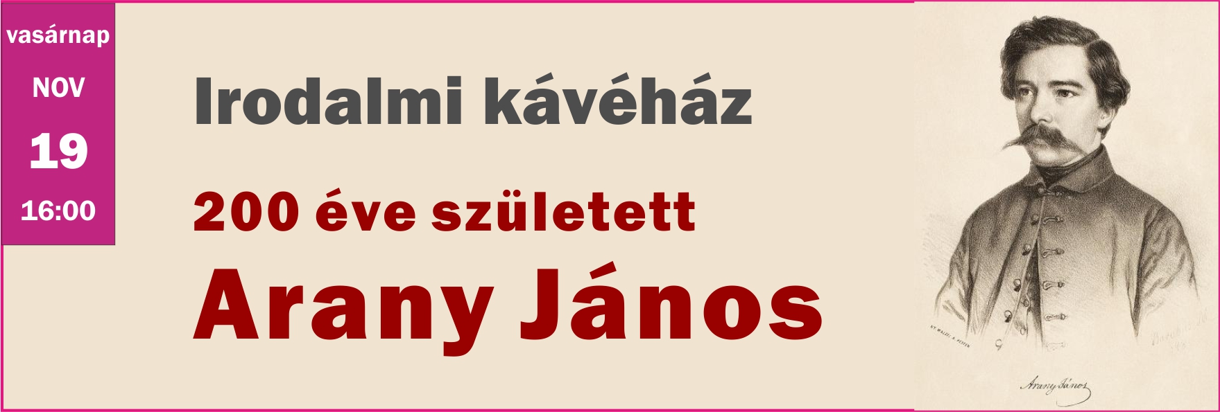 November 19-én tartottuk legutóbbi Irodalmi Kávéházunkat „200 éve született Arany János” címmel. Az emlékév jó alkalmat biztosított, hogy újra elmerüljünk a magyar irodalom kimagasló alakjának hihetetlen változatos költészetében.