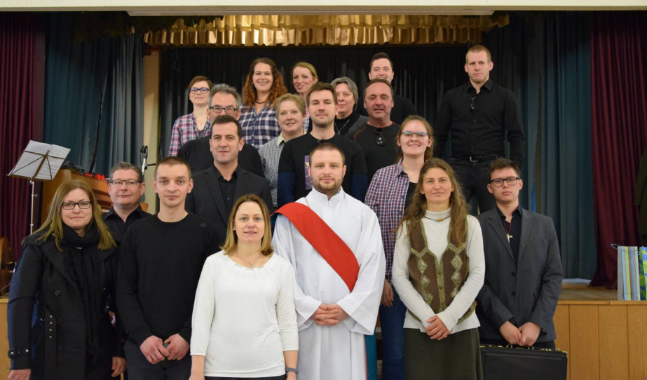 Majnek Antal segédpüspök (középen) az augsburgi Magyar Misszió plébánosával (balra), Spiller Krisztina közösségi diplomatával (jobbra) és a Misszió kórusával
