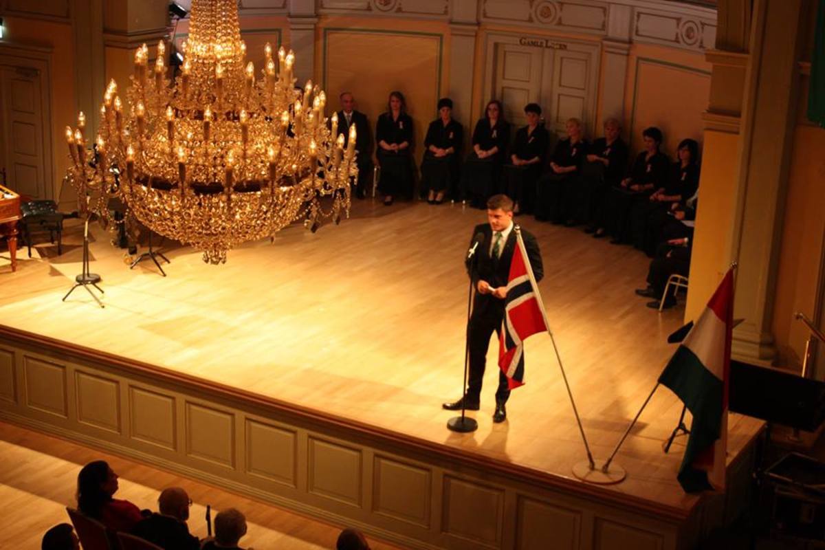 Október 24-e pedig a főesemény időpontja. A rendezvény helyszínét, a rendkívül impozáns és exkluzív Gamle Logen biztosította, ami Oslóban a legrangosabb események helyszíne. Nagyjából nyolcvan perces műsort láthatott a több mint négyszáz fő meghívott vendég. Az est házigazdája és konferansziéja, a híres norvég színész: Morten Röhrt volt, díszvendége pedig, Gyurta Dániel, magyar olimpikon. A megemlékezés részben magyarul, részben norvégul és angolul zajlott. A rendezvény lezárásaként, nívós fogadás várta a vendégeket.
