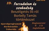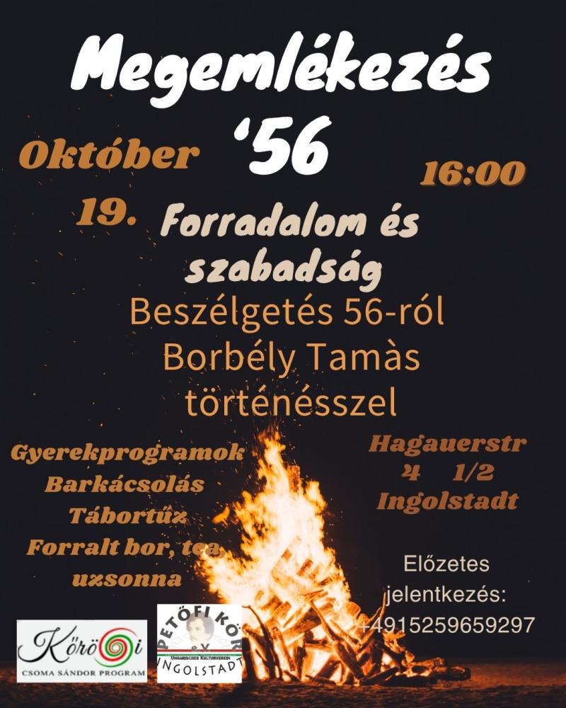 Az 56-os megemlékezésről szóló előadàst Forradalom és szabadság címmel Dr. Borbély Tamàs történész tartotta. A helyszín rendhagyó módon a szabadban volt, az érdeklődők hangulatos tábortűz körül ülve figyelték az előadást, amely kötetlen beszélgetéssel folytatódott. Míg a felnőttek a saját élményeiket, visszaemlékezéseiket osztották meg egymással, addig a kicsiket kézműveskedés várta. Az estet emelte, hogy mindenki finomabbnál finomabb falatokkal készült.
