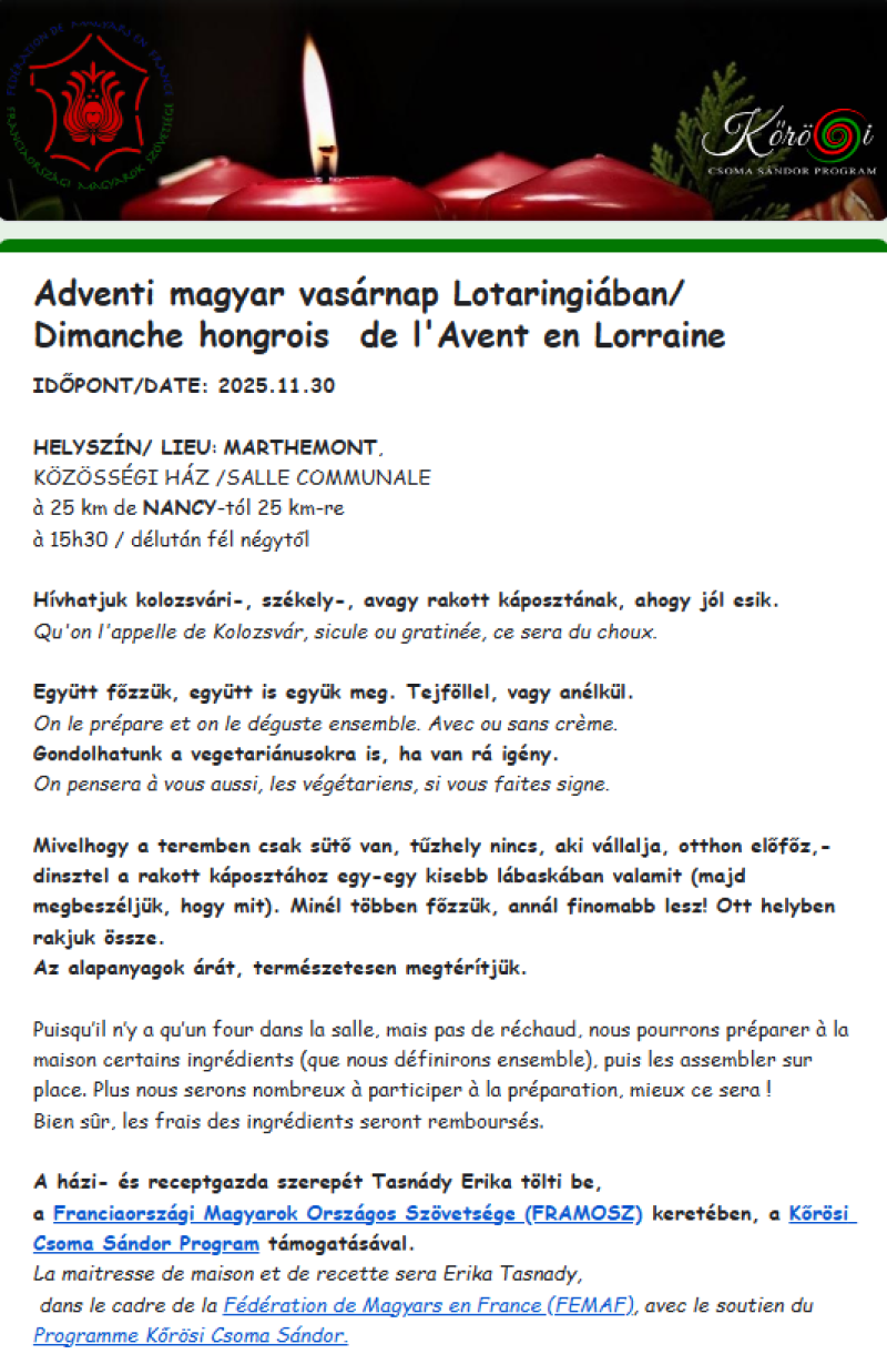 A már évek óta takaréklángon működő Lotaringiai Magyarok Egyesületével közös sütés-főzést, vacsorát szerveztünk Advent első vasárnapjára.