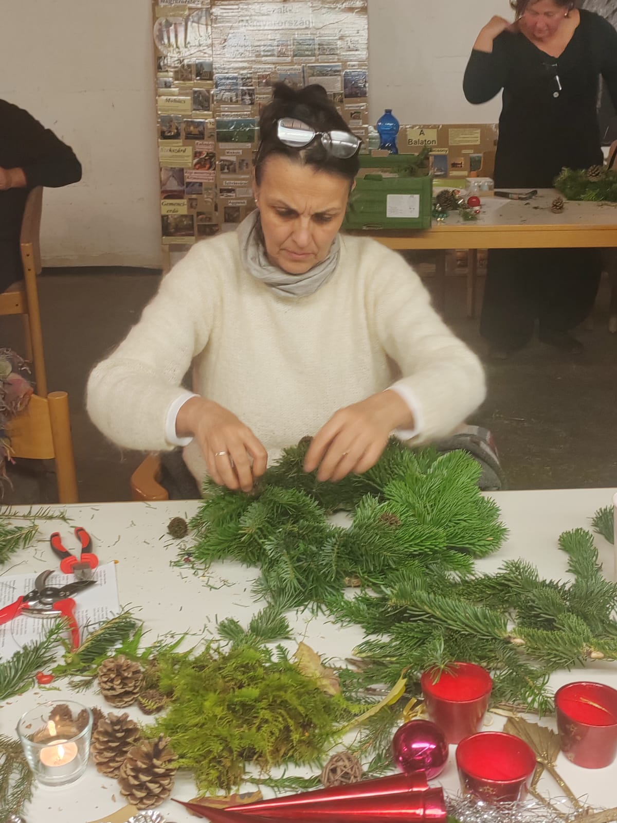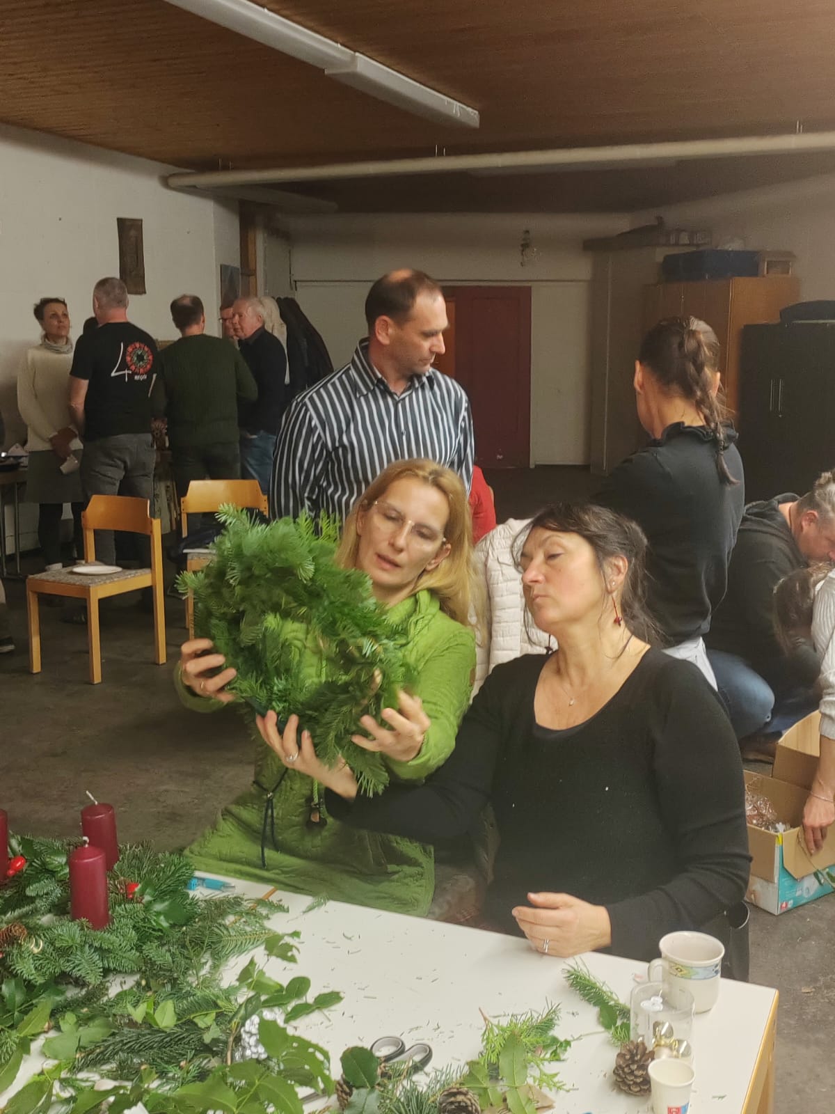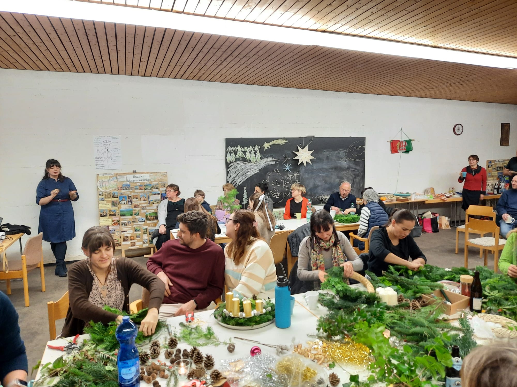 2024. november 30-án adventi hangulat töltötte meg a stuttgarti Katolikus Misszió alagsori termét. Az ajtón belépőket fenyőillat, karácsonyi zenék, képek és finom falatok, valamint a már az adventi koszorúk készítéséhez berendezett asztalok és eszközök fogadták.