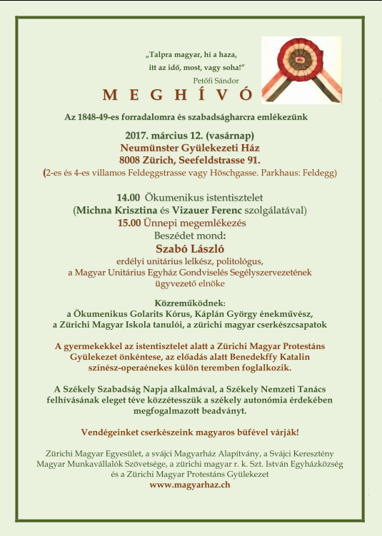 Svájc-szerte folytak és folynak a megemlékezések az 1848-49-es forradalomra és szabadságharcra. Zürichben március 12-én tartottuk ünnepi megemlékezésünket. Köszönet a képekért Szántó Andrásnak és Móréh Károlynak! Svájci Magyarház Alapítvány Zürichi Magyar Egyesület Zürich Svájc Svájci Keresztény Magyar Munkavállalók Szövetség