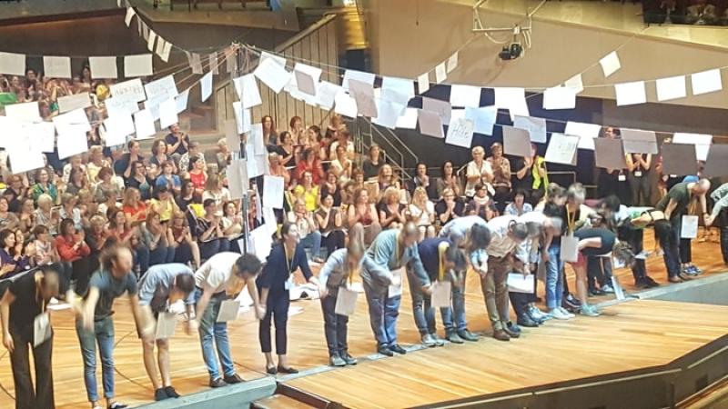Legközelebb a március 15-i ünnepségen énekeltünk, majd a május 19-én megrendezésre kerülő Public Domain című programban vettünk részt a Berlini Philharmonie rendezésében. A program közel 1000 énekest, különböző Berlinben működő kórusokat mozgatott meg, köztük a magyar kórust is. Hatalmas feladat volt nekem is és a kórusnak is, nagyon sok próbát és kitartást igényelt. Egy modern darabról volt szó, ahol a legtöbb esetben nem is éneklésről vagy vezénylésről volt szó, azt hiszem erről a képek is árulkodhatnak.