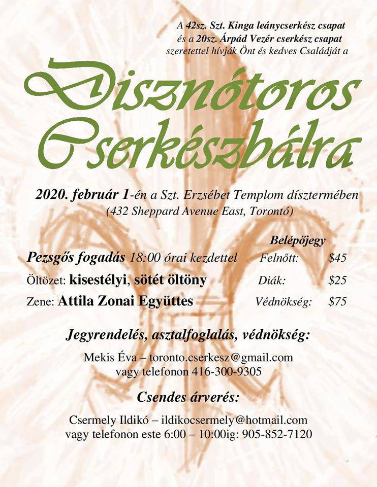 A 42sz. Szent Kinga Leánycserkész csapat, valamint a 20 sz. Árpád Vezér Cserkész csapat 2020. február 1-én rendezte meg idei disznótoros bálját. A torontói esemény helyszínéül a cserkészeket támogató Szent Erzsébet Plébánia díszterme szolgált. A vendégeket pezsgő várta, ami megalapozta a bulis hangulatot. A már hagyománnyá vált bál elengedhetetlen színfoltja volt a magyar néptánc: Izsák Zoltán és jómagam sárközi táncokkal nyitottuk meg a jókedvű összejövetelt. A cserkészvezetői megnyitó beszédet dr. Laky-Takács Péter konzul szavai követték. Ezek után a vendégsereg már nagyon várta a vacsorát. A cserkészek hurkát, kolbászt, savanyúságot szolgáltak fel. A vacsora után pedig indulhatott a tánc, melyet egy nagyon sikeres tombolasorsolás szakított meg.