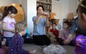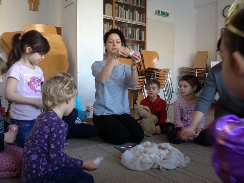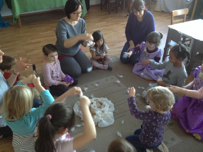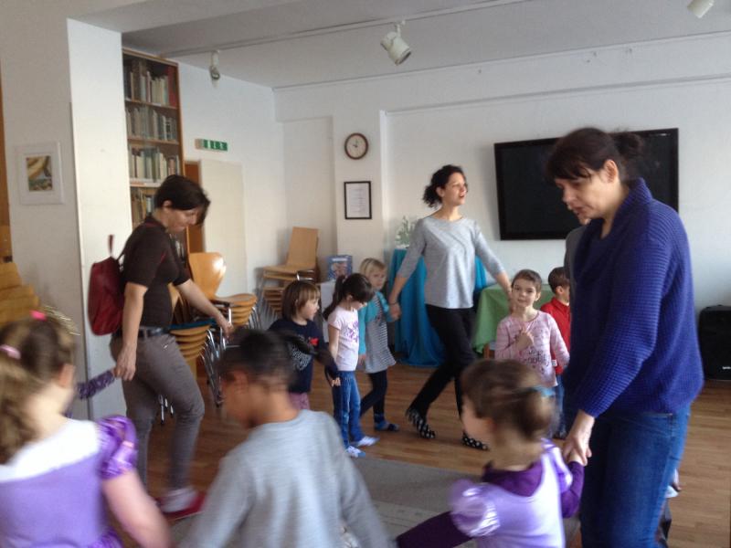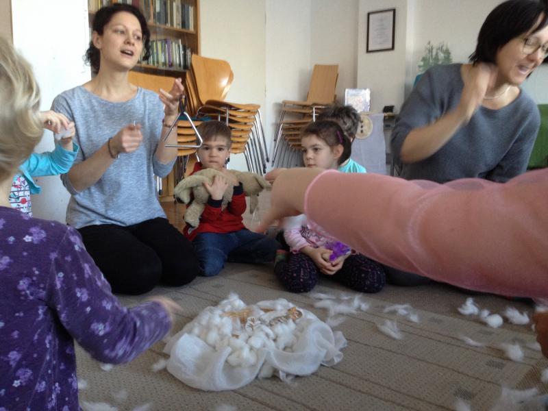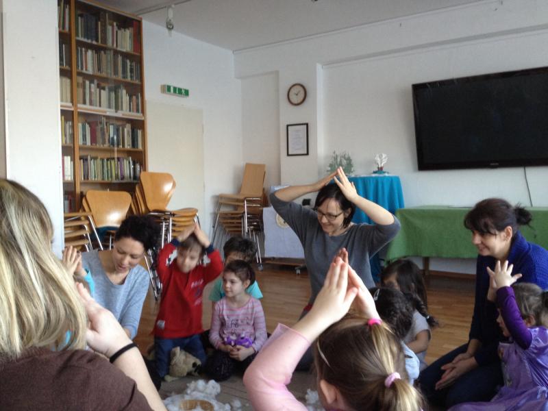 Szombat reggel Bécs utcái még csendesek, reggel kilenc óra körül épp, hogy beindul az élet. A szokatlan januári „melegben”, ragyogó napsütésben szállok fel az 1-es villamosra, s figyelem, ahogyan a házak közül kikandikáló napfény beszűrődik az ablakon. Mire a Schwedenplatzra érek, Dóri, Anna és Kriszti már előkészítették a 10 órától kezdődő óvodai foglalkozásra a termet – játszószőnyeget terítettek a koncerteknek, előadásoknak, találkozóknak, néptáncos és színházi próbáknak helyet adó nagyterem közepére, az ablak melletti asztalokon tányérok sorakoznak a közös falatozáshoz, a bábszínház díszletei az ajtó mellett felállítva várják, hogy kíváncsi gyerekszemek pihenjenek rajtuk.