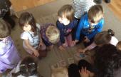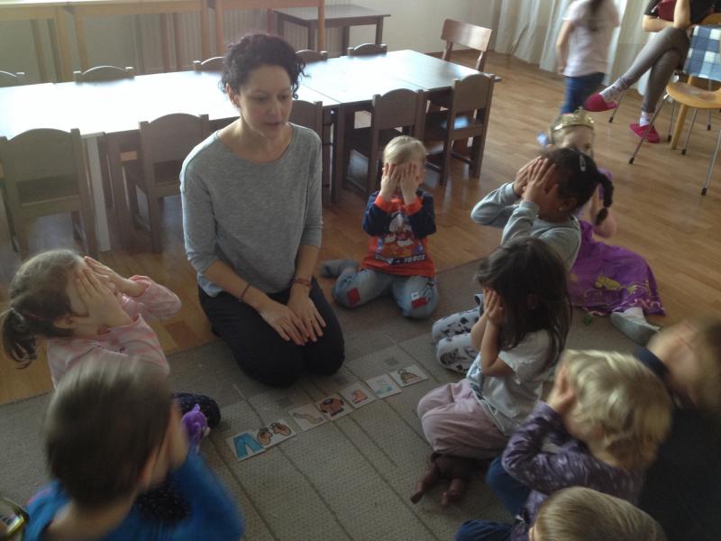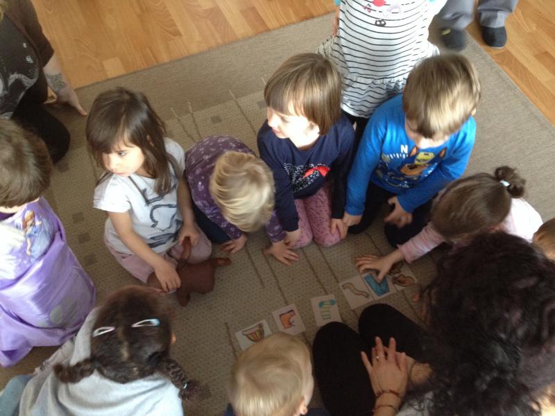 A megilletődött, álmos gyerekarcok hamar felélednek a közös éneklés során: először vattahópelyhekkel szórják tele a szőnyegen megbúvó kis veréb fészkét, majd kezecskéikkel házikót formálva menedéket adnak a kismadárnak. Néhány később csatlakozó gyerek is nagy örömmel kapcsolódik a játékba. Akkor tudom meg, hogy valahol esett a hó előző este, sőt, egyesek még szánkózni is mentek kora reggel. Később Dóri találós kérdésekkel kelti fel a gyerekek érdeklődését, amelyek mindegyike egy-egy téli ruhadarabra vonatkozik. A kicsik lelkesen keresgélik a teremben elrejtett számokat, amelyek alatt a találós kérdések, illetve a kis ruhadarabokat ábrázoló képecskék rejlenek.