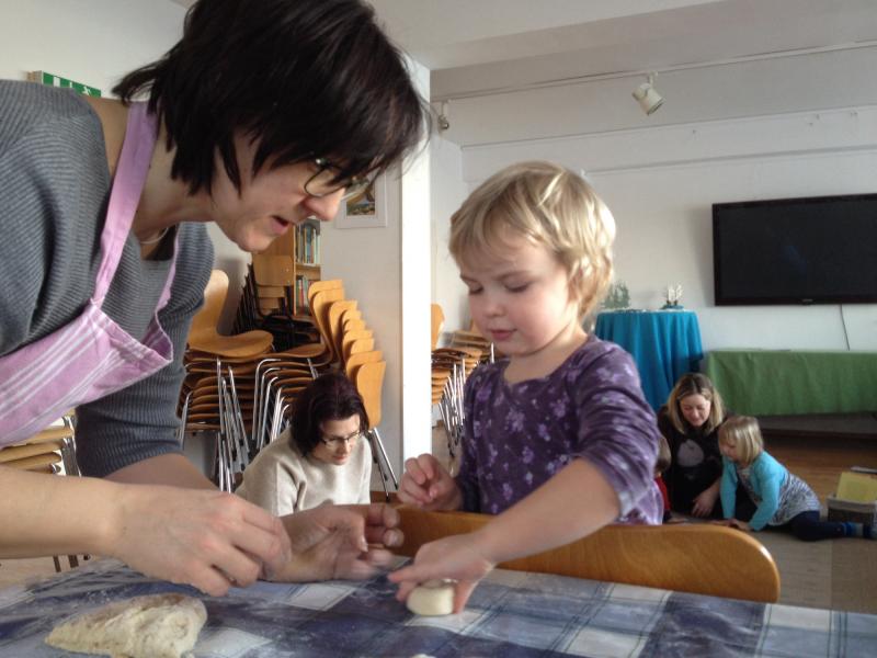 Anna a konyhában tüsténkedik, hiszen a mai alkalom különleges: a kétórás foglalkozáson kalácsot sütnek majd a gyerekekkel. Kérdésemre elmondja: egyszer sós cipót, máskor édes, tönkölylisztből készült kalácsot sütnek. Mire Anna a sütőbe teszi az összegyúrt tésztát, hogy alkalmas időre megkeljen, már hallani az előtérben gyülekező gyerekek hangját.