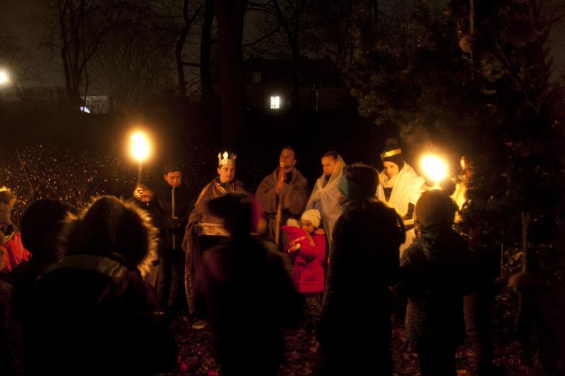 Az ünnepi alkalomnak két fő része volt. Elsőként a cserkészek különleges erdei karácsonya során a gyermek és felnőtt érdeklődők a karácsony esszenciáját gyűjthették össze a közeli parkban egy fáklyás felvonulás keretében. A tóparti parkban a résztvevők sorban találkozhattak a karácsony fontos szereplőivel és az általuk képviselt szimbólumokkal, illetve mondanivalóval. A menet végén a gyermekek megajándékozták a park madarait: a fákon és bokrokon elhelyezték az előzőleg közösen elkészített karácsonyfadíszként is működő téli madáreledeleket. A program meghitt és bensőséges hangulatot kölcsönzött az együttlétnek.