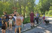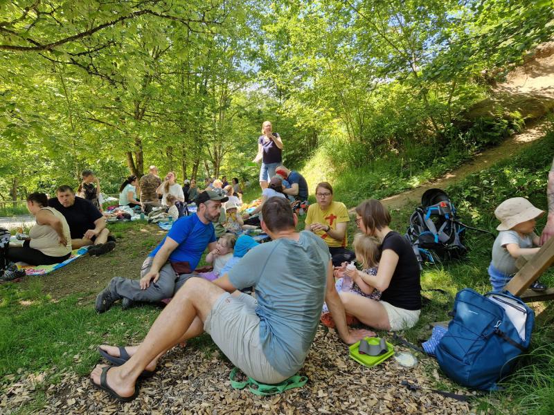 Az útvonal felénél tartottunk egy pihenőt: egy közös, iskolai piknik keretében mindenki megoszthatta egymással az otthonról hozott finomságokat, a gyerekek pedig birtokba vették a helyi játszóteret. A pihenő ideje alatt a gyerekek két tematikus állomáson keresztül ismerkedhettek meg a környék élővilágával: madárhangokat hallgattunk, fákat és növényeket vizsgáltunk, terméseket gyűjtöttünk.