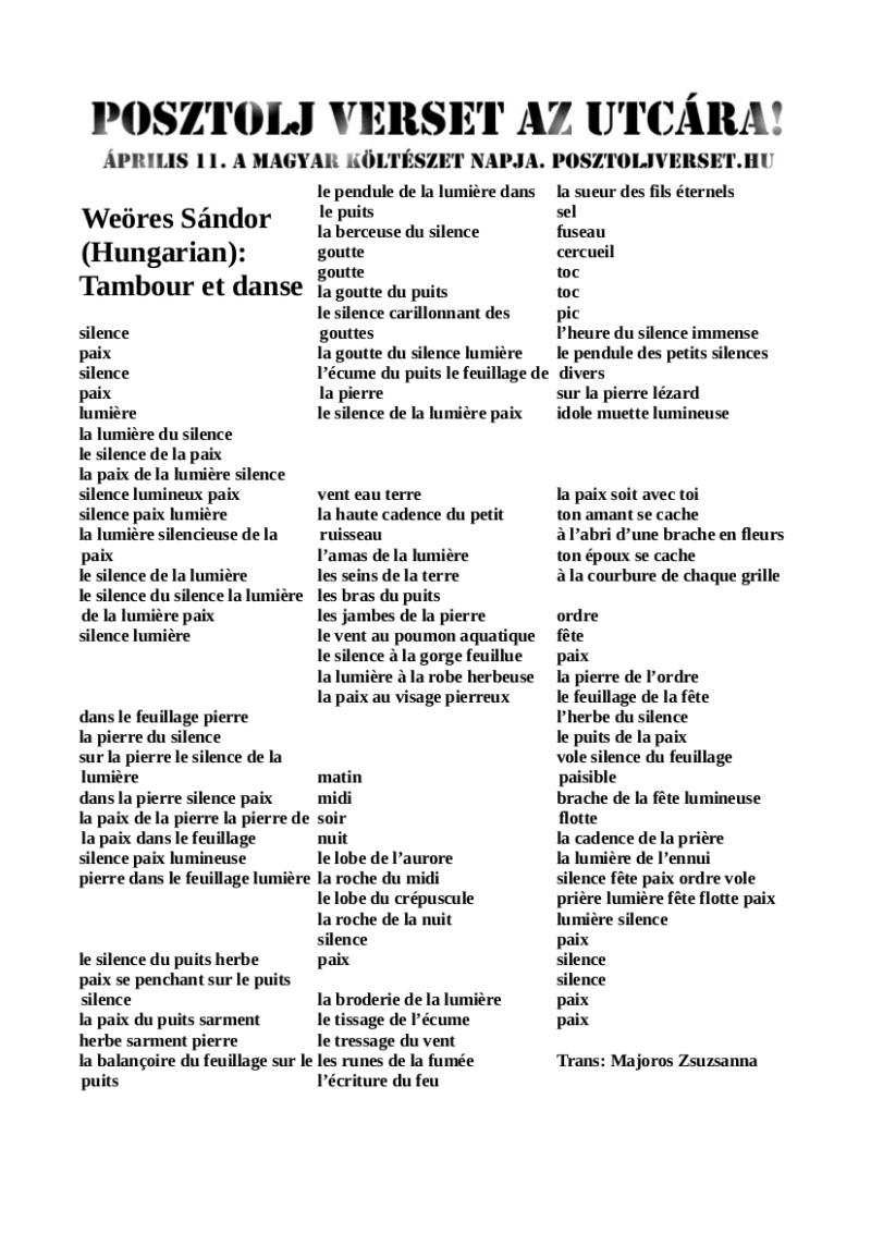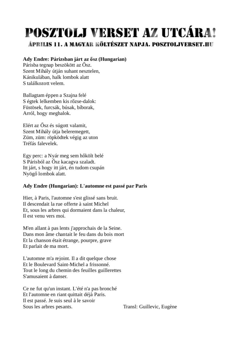 A grenoble-i magyaróra egyik mozzanata a Posztolj verset az utcára! felhíváshoz való csatlakozásunk lett a tanítványokkal. A magyar költészet remekeit “posztoltuk” magyar és francia változatban. Akciónk nyomán Ady Endre, József Attila, Weöres Sándor verseit lehet Grenoble utcáin olvasni.