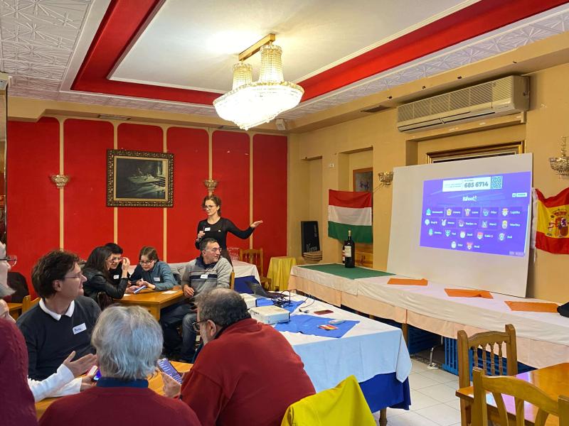 Négyfős csapatokat kértem, és kifejezetten arra biztattam a résztvevőket, hogy spanyol és magyar ismeretekkel rendelkező vegyes csapatokat alakítsanak. A cél nem csupán a játék volt, hanem az is, hogy még jobban megismerjük egymást, és a két kultúra tudása, élményei összeérjenek az asztaloknál. A gyerekeknek külön hungariukomos tesztet készítettem.