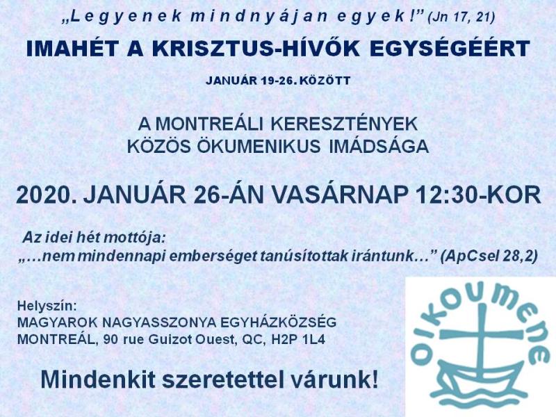 A nemzeti összetartozás évében még január utolsó vasárnapján, a keresztények egységéért tartott imahét zárónapján, a montreáli Magyarok Nagyasszonya templomban tartottunk egy közös ökumenikus imádságot, melyen egy katolikus és két protestáns felekezet hívei és lelkészei vettek részt. Az imádságos együttlétet és az azt követő agapét Gergely Katalin, a Kőrösi Csoma Sándor Program ösztöndíjasa szervezte, aki bevezető szavaiban hangsúlyozta az esemény fontosságát - a nemzeti összetartozás évében különböző felekezetű magyarok imádkoznak az egységért.