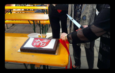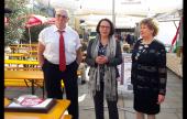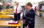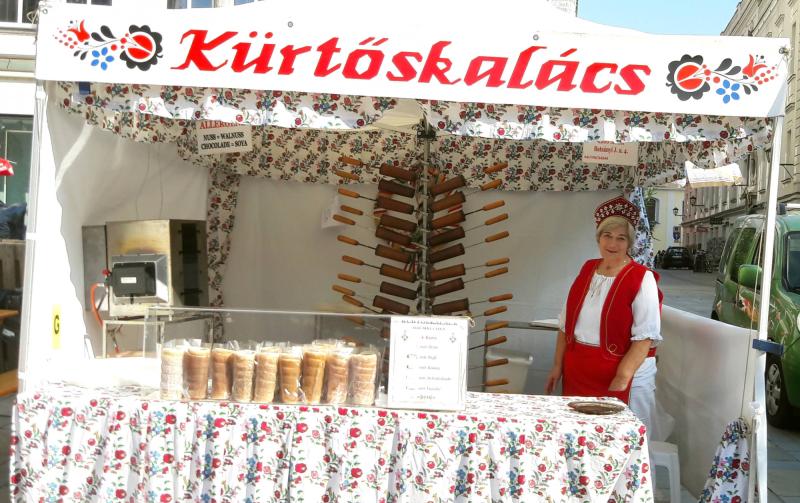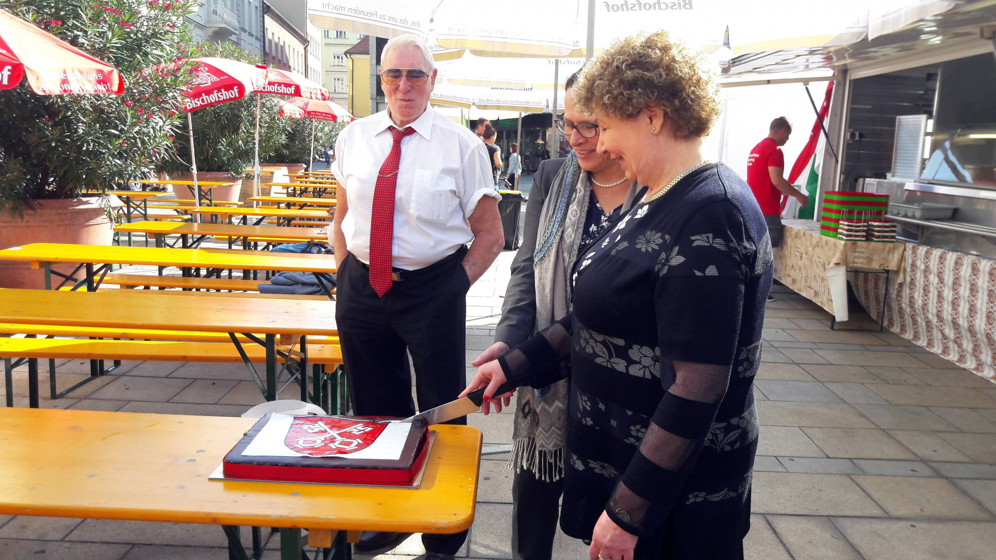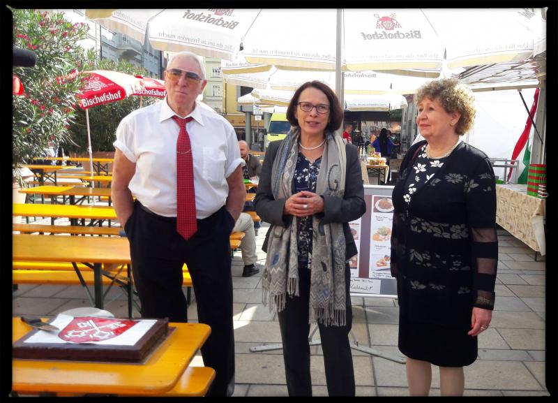 A megnyitóra 11 órakor került sor. A szorgoskodó Rét Ivánné Beatrixot és színes csapatát Gertrud Maltz-Schwarzfischer polgármesterasszony köszöntötte, hangsúlyozva, mennyire örül a magyar-német együttműködés effajta megvalósításának, illetve a pezsgő magyar életnek Regensburgban. Nemcsak a Duna az, ami a két népet összeköti – mondta -, hanem a közös evés és ivás is. Amire egyébként szintén lehetőség volt, hiszen igazi magyar konyha és pincészet is érkezett a vándorló piaccal. A helyiek magyar ételeket és italokat, savanyúságokat kóstolhattak. És miután a polgármesterasszony megtartotta köszöntőbeszédét, a magyar-német küldöttség együtt vágta fel a Stadt Regensburg jelképpel ellátott tortát. Ezzel megkezdődhetett az idei őszi magyar piac Regensburgban.