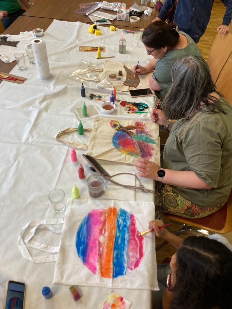 A júniusi alkalom a textilfestésé volt. A résztvevők színes batikolt pólókat készíthettek, illetve sokan vászontáskára festettek textilfestékkel. A gyerekek körében főleg a batikolás volt népszerű, kitartóan mártogatták a festékbe az anyagaikat, a végén pedig csodálatosan tarka lett az eredmény.