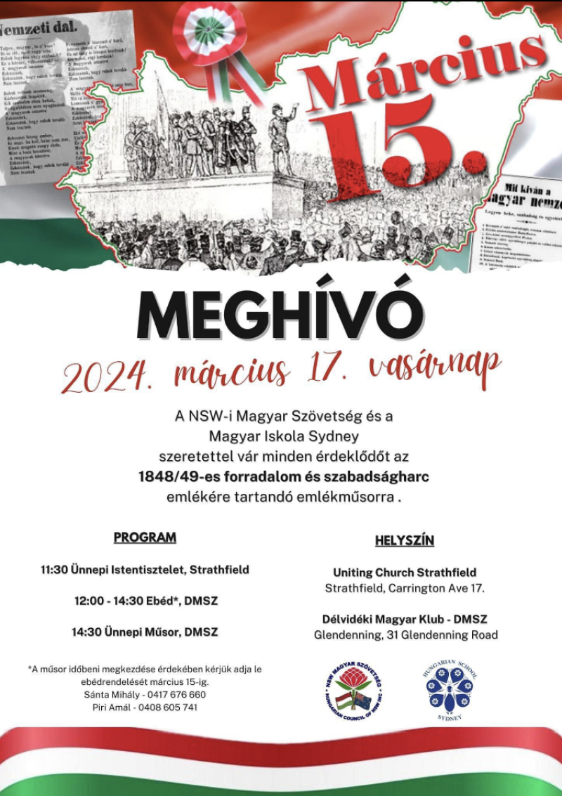 Mint minden magyar közösség, így a Sydney-ben élő magyarok is megemlékeztek az 1848/49-es forradalom, és szabadságharcról. A szinte egy egész napon át tartó emlékünnepély a Sydney Magyar Református Egyház istentiszteletével kezdődött, majd a Délvidéki Magyar Klubban ebéddel, és ünnepi műsorral folytatódott. A NSW-i Magyar Szövetség, és a Magyar Iskola Sydney színvonalas emlékműsorán az iskola tanulóival közösen, a Sydney Magyar Cserkészet, és az Iciri-piciri játszóház gyerekei, valamint a Kőrösi Csoma Sándor Program ösztöndíjasai vettek részt. A nem mindennapi előadás a közönség soraiban ülő szülők, nagyszülők, és megemlékezők szemeibe könnycseppet, a fellépők szívébe pedig felejthetetlen emléket teremtett.