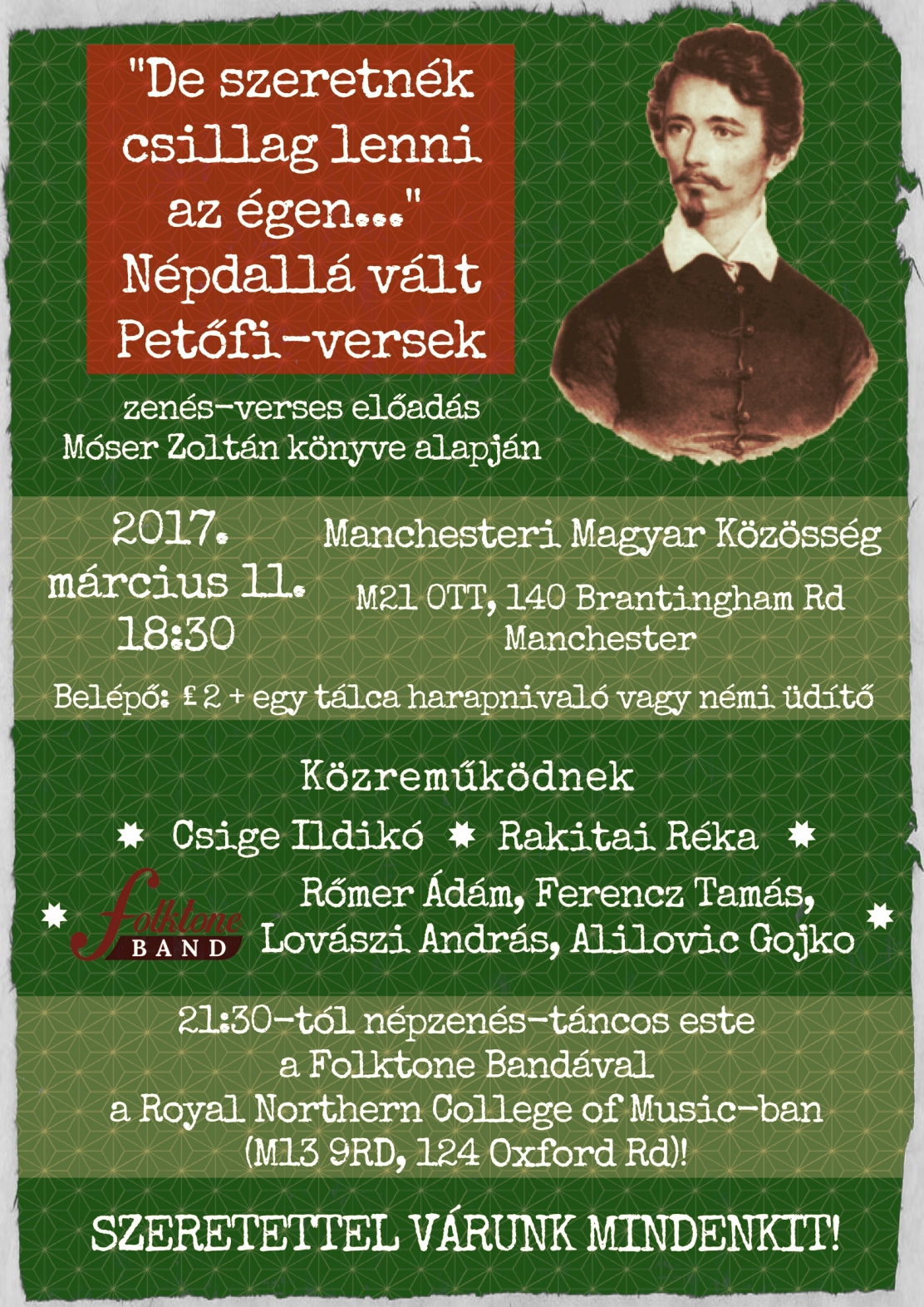 Március 11-én szombaton a Zsigmond Király Magyar Iskola és a Manchesteri Magyar Közösség szervezésében egy zenés-verses est keretében emlékeztünk meg a 1848–49-es forradalom és szabadságharc évfordulójáról.