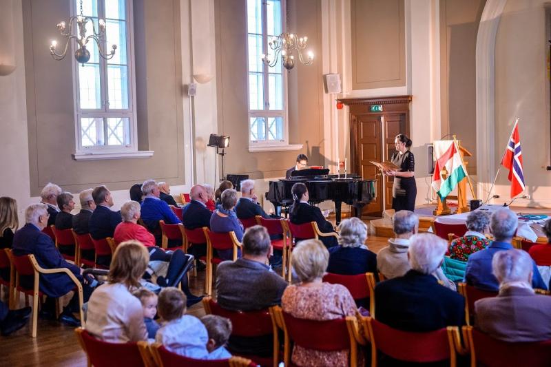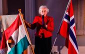 Október 20-án szombaton délután 16 órától közösen emlékeztünk meg 1956-os bátor hőseink dicső tetteiről. Nagy Lúcia Mária, a Norvég-Magyar Egyesület elnökének megnyitó szavait követően Magyarország oslói nagykövete Sikó Anna Mária tartotta meg ünnepi beszédét. Megköszönte a jelenlévő szabadságharcosoknak, hogy bátorságuknak köszönhetően ma együtt ünnepelhetjük hazánk legfontosabb nemzeti ünnepét. A magasztos szavakat Nagy Gábor zongoraművész és Gáspár Tünde operaénekesnő közös előadása követte, mely során felcsendült Kodály Zoltán Ifjúság, mint sólyommadár című darabja is. A Himnusz közös eléneklését követően egy rövid dokumentumfilm képei elevenítették fel a 62 évvel ezelőtti forradalmi napok hangulatát. Az ünnepi műsort követően magyar borokkal koccinthattunk 56 emlékére.