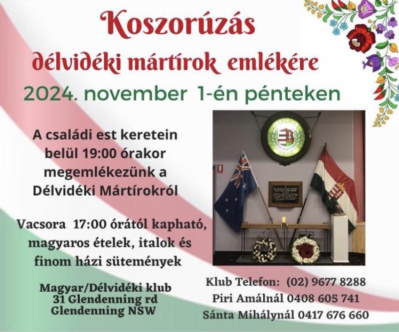 Az 1944-45-ös délvidéki mártírok tiszteletére 2024. november 1-jén megemlékezést tartottak a Sydney-ben élő magyarok. Az emlékműsort és az azt követő koszorúzást, mint minden alkalommal, a Délvidéki Magyar Szövetség Székházában rendezték meg.