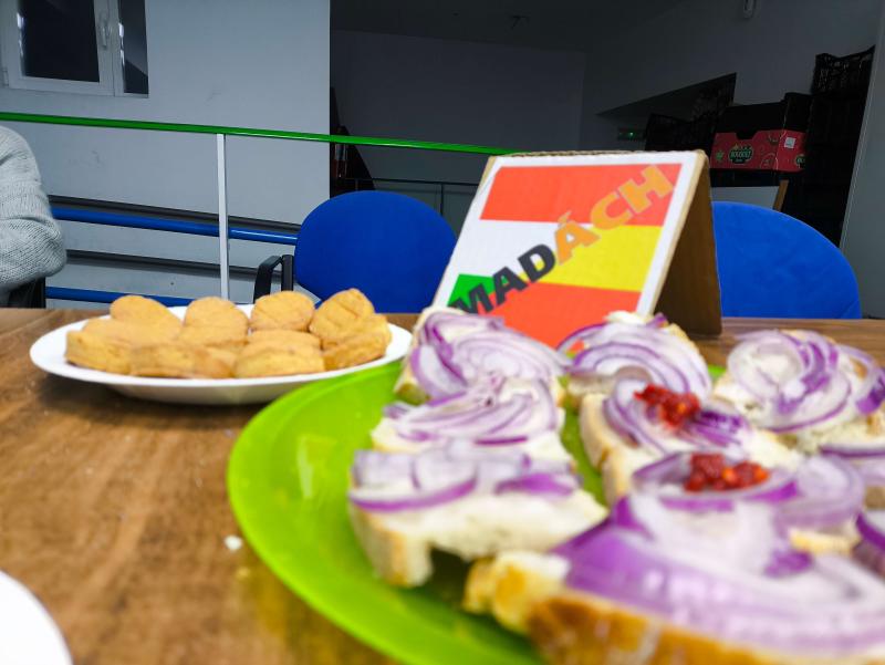 Bevallom, nagyon izgultam. A bizonytalanság miatt nem készültem végül a házi süteménnyel, de ekkor jött a nagy ötlet: zsíroskenyér lilahagymával! Ez az! Ez lesz a magyaros vendégváró falat, hozzá pedig forró tea – egyszerű, de a szünteben pont jó lesz harapnivalónak! A zsíroskenyér osztatlan sikert aratott: a magyaroknak nosztalgikus élményt, (volt aki már a sült krumpit tervezte hozni a következő rendezvényre) a külföldieknek pedig igazi kulináris különlegességet jelentett. Spanyolországban ugyanis ez az étel szinte ismeretlen – és talán épp ezért volt olyan népszerű, hogy szinte pillanatok alatt elfogyott.