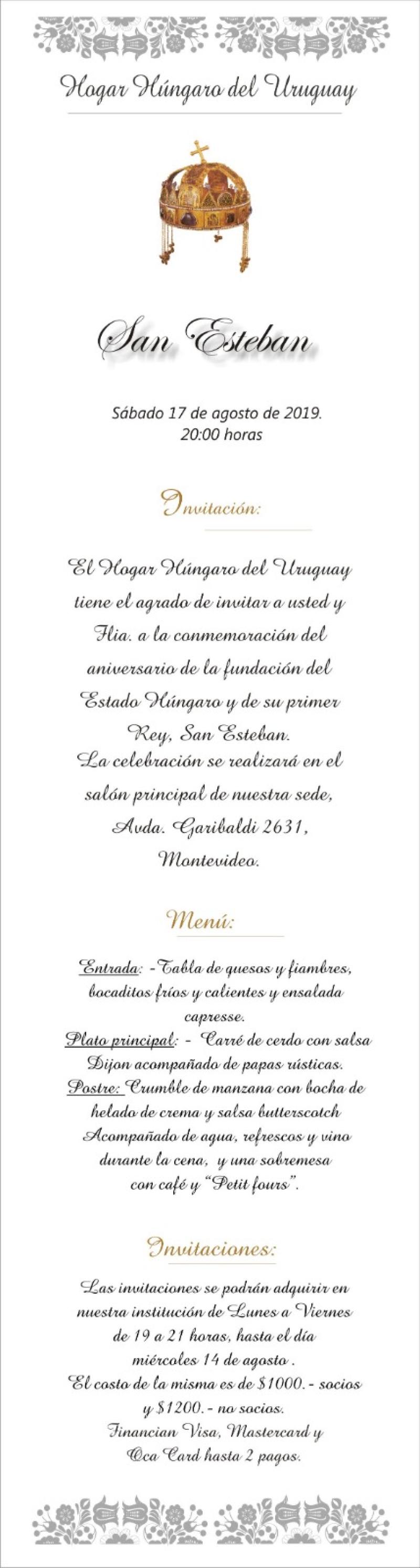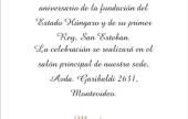 A 2019-es esztendőben augusztus 17-én, szombaton este emlékeztünk I. István államalapító királyunkra az Uruguayi Magyar Otthonban. Az ünnepséget hosszas és intenzív felkészülés előzte meg. A július végén Magyarországról visszatért két néptánc csoportnak, a Tündérkert és a Szivárvány csoportoknak napi próbájuk volt, a többi néptánc csoportnak pedig heti kettőre emelkedett a szokásos heti egy próba. A népi viseletek raktárából előkerültek a mezőségi viselet férfi és női ruhái, kiegészítői. A két műsorvezető, egy spanyol és egy magyar nyelvű konferanszié a konferálások szövegét aktualizálta az előző évről és összeolvastak. Az épület belsejét is felkészítették a megemlékezésre: újrafestették az előtér és a nagyterem lábazatát, laminált padlót raktak le, és általános nagytakarítás előzte meg az év legnagyobb eseményét. Az Uruguayi Magyar Otthon tagjai büszkék arra, hogy az intézmény alapítása, 1936 óta minden éven, minden körülmények közepette sikerült megemlékezni a magyar állam alapításának ünnepéről.
