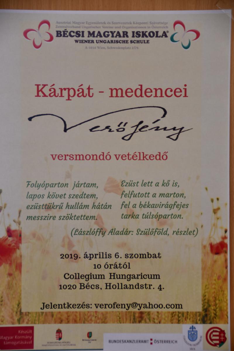 Az Ausztriai Magyar Egyesületek és Szervezetek Központi Szövetsége idén is nagy sikerrel hirdette és rendezte meg a Kárpát-medencét átívelő Verőfény szavalóversenyét. A több mint félszáz jelentkező Bécsből, Innsbruckból, Linzből, Délvidékről, Felvidékről és Erdélyből érkezett. Pirityiné Szabó Judit, a Nemzetpolitikai Államtitkárság főosztályvezetője is a zsűri tagja volt.