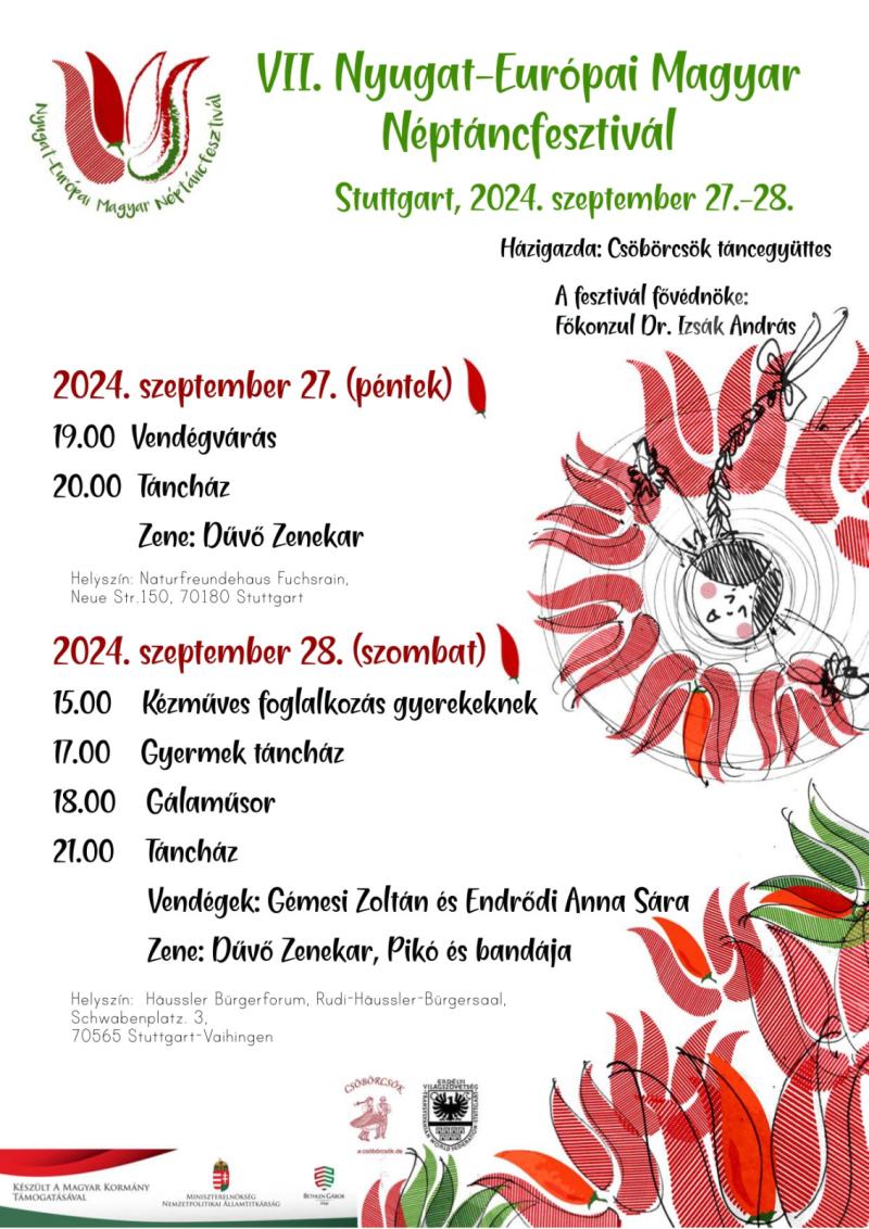 2024. szeptember utolsó hétvégéjén magyar népzenétől volt hangos a stuttgarti Naturfreundehaus Fuchsrain étterem, valamint a Häussler Bürgerforum közösségi központ. Ezekben a napokban zajlott a VII. Nyugat-Európai Magyar Néptáncfesztivál a Csöbörcsök Néptáncegyüttes szervezésében.