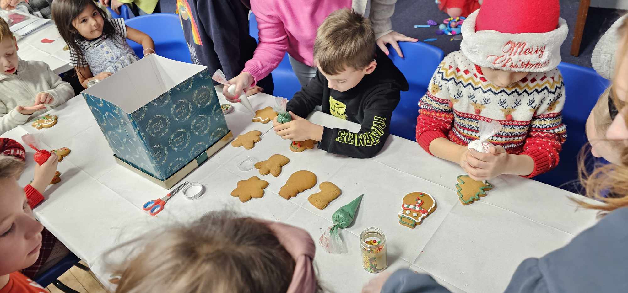 A Zsigmond Király Magyar Iskola növendékeinek és tagjainak nem kellett sokat várni a következő meghitt és grandiózus eseményre, hiszen december 16-án karácsonyi nyílt napot hirdettünk. Ez sokkal bensőségesebbre sikerült, mint a december 2-i rendezvény, de ez is volt a cél. Ez alkalommal csak az Iskola jelenlegi diákjai, szülei és a manchesteri Főkonzulátus, valamint Trafford polgármester asszonya vett rész. A program közös éneklésből, táncházból, kézműves foglalkozásokból és karácsonyi diavetítésből állt. De nem maradt el a karácsonyfa díszítés és a közös lakomázás sem a Szeretet asztaláról, amihez minden résztvevő hozzájárult. Nagy öröm volt, hogy erre a különleges alkalomra iskolánk alapítója, Bartos Gábor is ellátogatott és nagylelkű adományával tovább emelte a program színvonalát. Vendégeink kötetlen beszélgetés keretében ismerkedhettek meg iskolánk 10 évének történetével Bartha Miklós megbízott igazgató előadásában, miközben megkóstolhatták a hagyományos magyar karácsonyi finomságokat: a diós és mákos bejglit és a sajtos pogácsát.