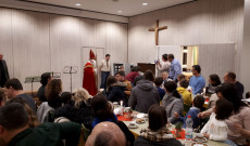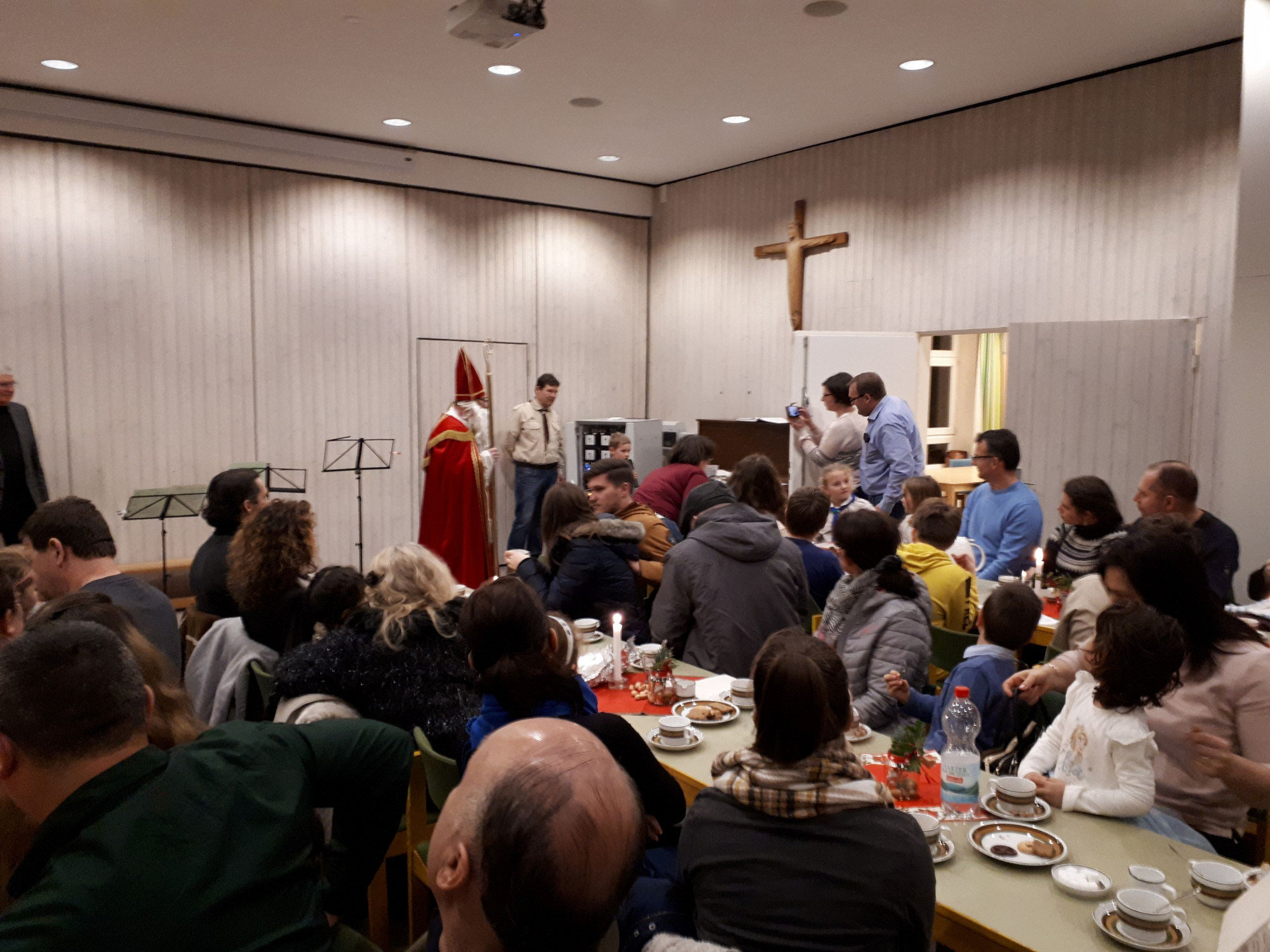 A szentmise után átvonultunk a templom melletti óvodába, ami tulajdonképpen már egybeépült vele. Itt két terem egy konyhával együtt ad otthont az agapé ünnepségeknek. A gyülekezet lelkes segítői már gyönyörűen megterített asztalokkal vártak minket, süteménnyel, teával, kávéval kínálva, valamint szintén itt alakítottuk ki az előadás helyszínét. A Mikulás érkezését zongoraszó kísérte, S. Éva tolmácsolásában, aki az egyik lelkes segítőnk és vezetőségi tagunk a hamburgi közösségben. Az ajándékokért a Mikulás minden gyermektől egy-egy éneket vagy verset kért cserébe, amit a legtöbben nagy élvezettel adtak elő. Az ajándékosztást követően került sor a HMI (Hamburgi Magyar Iskola) tanulóinak a műsorára. Zenés-verses előadással készültünk a Mikulás és a közönség számára, amihez szintén kaptunk kíséretes aláfestést nem csak Évától, hanem lányától, Katikától fuvolán. Illetve lelkes anyukák is besegítettek az éneklésbe. A műsort követően számos gyerek kibontakoztatta zenei tehetségét, ki mikrofont ragadt és énekelt, ki leült a zongorához és játszott, de volt, hogy egyszerre többen adtak elő egy dalt. Ezalatt megkezdődött az agapé, a felnőttek beszélgettek, a gyerekek játszottak. Szerencsére a pozitív visszajelzésből sem volt hiány, mind a szülők részéről, mind Pál atya részéről.