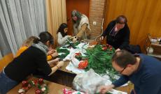 Kisgyermekek, anyukák, apukák és a nyugdíjasok is képviseltették magukat, így egy igazán családias közös alkotó délután kerekedett, amihez a karácsonyi hangulatú zenék is nagyban hozzájárultak. Mindenki nagy lelkesedéssel rögzítette a koszorú alapra a fenyőágakat, majd a színben és formában leginkább tetsző díszeket gondosan helyezték a gyertyák köré. Voltak, akik annyira belelendültek az alkotásba, hogy a koszorú után még ajtódíszt is készítettek.
