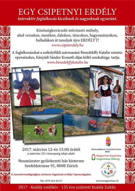 A gyermekekről az ünnepség alatt sem feledkeztünk meg. Velük a székelyföldi származású, jelenleg Budapesten élő Benedekffy Katalin színész-operaénekes foglalkozott egy közösségkovácsoló művészeti műhely keretében, ahol a gyerekek mesék, táncok, balladák, játékok és népszokások segítségével ismerkedtek Erdély gazdag kultúrájával.