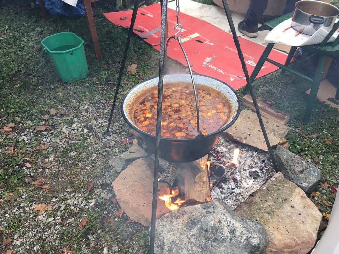 Szombaton reggel aztán indult az előkészítés, tűzrakás, a helyszín biztosítása, majd a pörkölt alap elindítása a 70 literes bográcsban. Olyan jó alapot sikerült készíteni, hogy mindjárt két bográcsban és két fazékban rotyogott tovább mennyei illatokkal a gulyás. Délutánra el is készült, amit a lassan érkező vendégek már messziről kiszimatoltak.