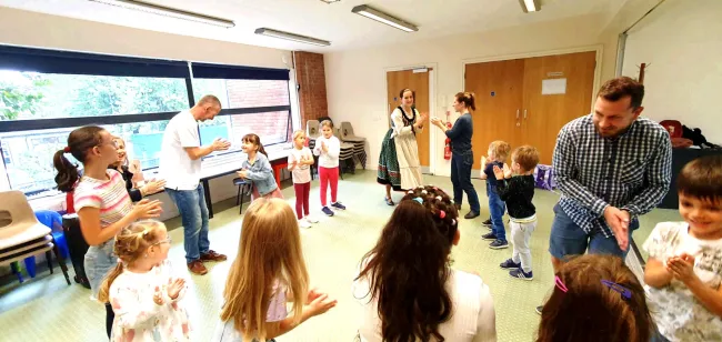 Délutáni foglalkozásként játékos néptánc foglalkozást tartottam és igazán feltöltődtem a mosolygós gyermekek között. Megismerkedtünk a ropival, hiszen Angliában nem lehet kapni ezt a rágcsálnivalót és az egyik játék közben a gyermekek megkérdezték tőlem, hogy mi is az. Szerencsére az egyik kisfiú már evett az apukájával ilyet, így könnyen el tudtuk mondani a többieknek miről is van szó.