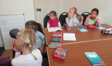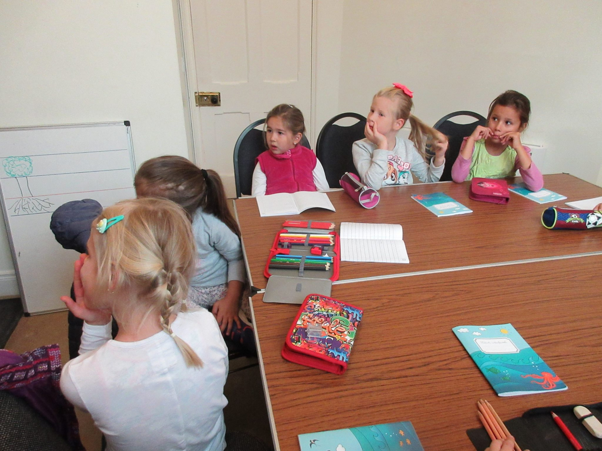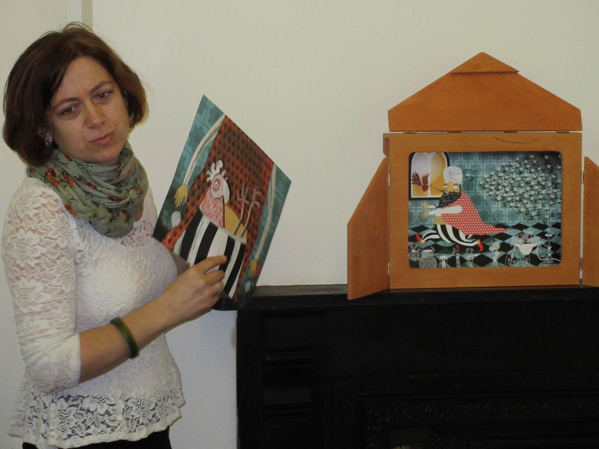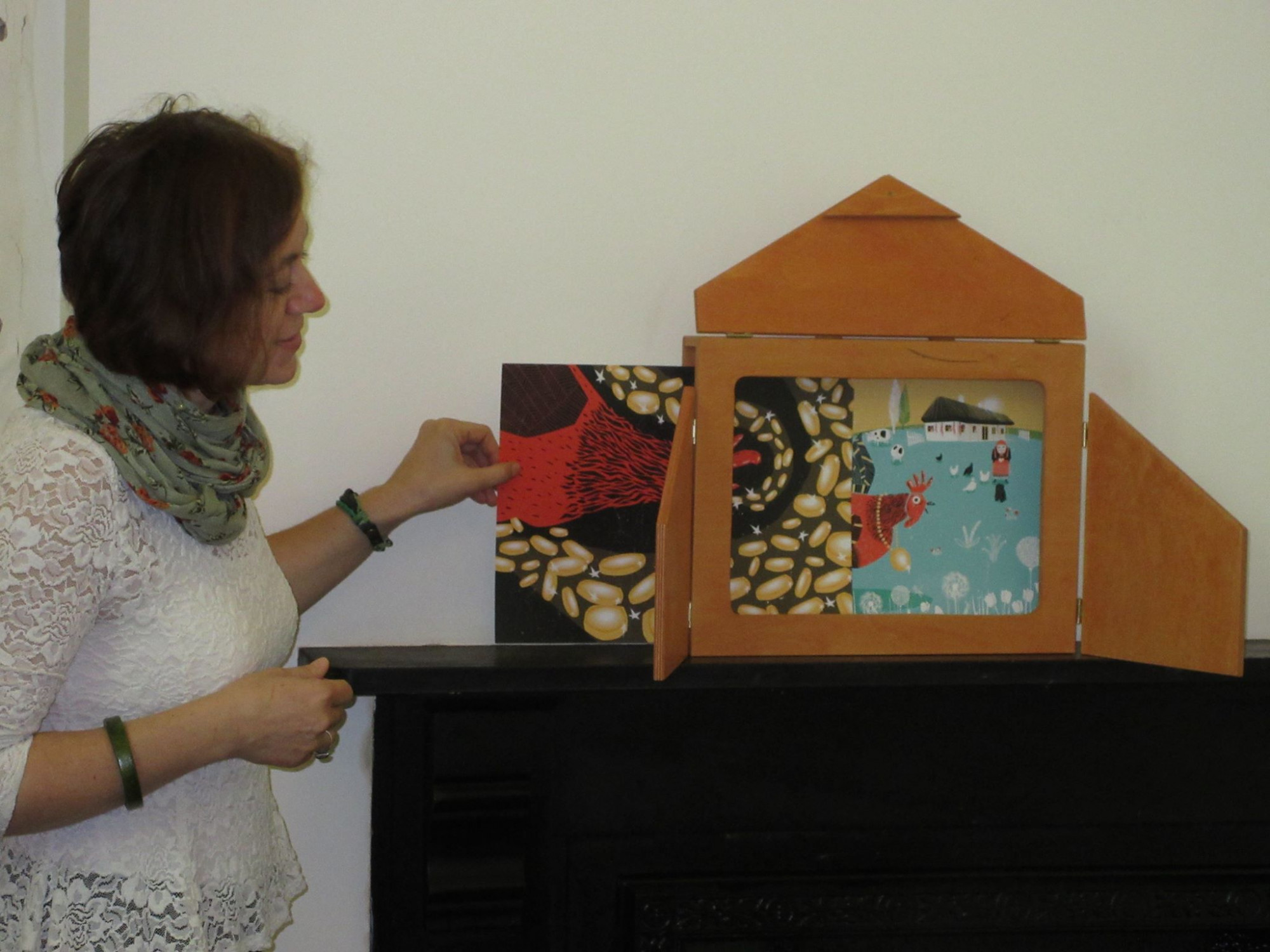 Az élőszavas mese mellett ezen a szombaton az elsőseim egy másik mesélési módszerrel ismerkedtek – a papírszínházzal. Ennek az a lényege, hogy a mesélő szemben áll a gyerekekkel, és a speciális, színházszerű fakeretben álló lapokat sorban mutatva majd kihúzva meséli el a mesét, így a közönség a nagy méretű illusztrációkon jól láthatja a történet kiemelt pillanatait. A módszer jelen formájában Japánban született meg száz évvel ezelőtt, de közel tíz éve Magyarországon is elérhető. Azért hoztam el magammal Írországba a „varázsbőröndöt”, mert úgy gondolom, hogy a papírszínház különösen jól alkalmazható a diaszpóra gyerekközöségeiben: hiszen a nagy képek segítségével azok a gyerekek is megértik a történetet, akiknek a meseszöveg olykor nehéznek bizonyul.