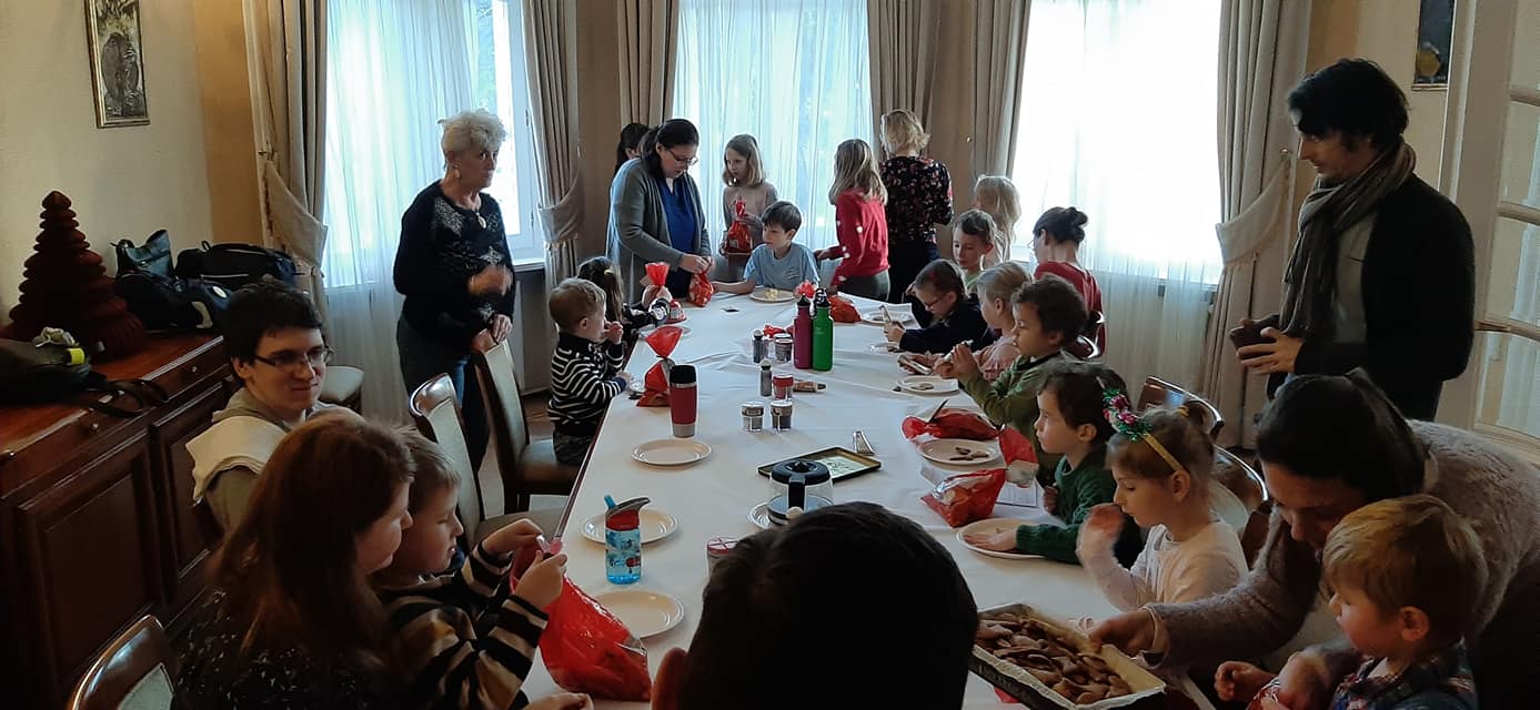 Reggel 10 órától az ovisok és a kisiskolások csoportja egyaránt rendhagyó helyszínen, a magyar nagykövetségen vehetett részt az idei év utolsó tanóráján, amin természetesen a Mikulás és a karácsonyi ünnepkör volt mindkét csoportban a témánk. Karácsonyi és Mikulásváró énekekkel, versekkel és mesékkel búcsúztattuk az évet. A kisebbekkel még közös zenélést is csaptunk. A foglalkozást követően a gyerekek megkapták a Mikulás által véletlenül a nagykövetség ablakában felejtett, de szerencsére névre szóló csomagjaikat is. Ezután kezdődhetett a várva várt mézeskalács gyártás. A szorgos kis kezek közösen gyúrták, nyújtották és szaggatták a mézeskalács tésztát, majd a kisült harangokat, fenyőfákat, hópihéket és balerinákat gondosan díszítették, öltöztették karácsonyi mázba. Eseménydús és méltó évzáró foglalkozást tartottunk, jövőre is ugyanígy folytatjuk.