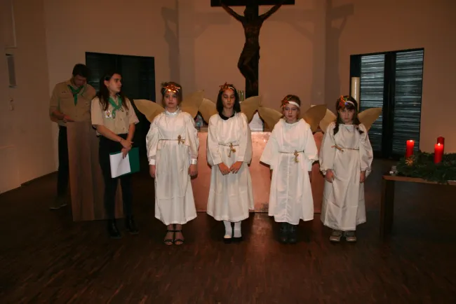 Attila atya köszöntőszavai után a sieglangeri Maria am Gestade-plébániától kölcsönzött jelmezekbe öltözött cserkészek hangszeres játékokkal kísért karácsonyi énekekkel, szentírásrészletek, elmélkedések felolvasásával, az adventi gyertyák meggyújtásával és imával ünnepelték meg a kis Jézus megszületését. A gyönyörű és tartalmas műsort Schenk Angyalka cserkészvezető úgy állította össze, hogy az éneklésbe a közönséget is bevonta, ami külön élményt jelentett a sok csillogó szemű anyukának, apukának. A Miatyánk közös elimádkozása után ismét Nagy-György Attila atya szólt a jelenlévőkhöz. Karácsonyi áldásszavaiban így fohászkodott: „A Betlehemben és a szívünkben megszülető Istenfia, a mi Urunk, Jézus Krisztus küldje kegyelmeit számunkra angyalaival, hogy az ő békéje, szeretete és öröme töltse el mindannyiunk és családjaink szívét, magyar közösségünket.”