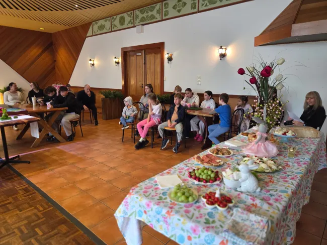 Az előadás után rövid kulináris kalandba kezdtünk, avagy együtt csipegettünk a szülők és a tanárok jóvoltából létrejött húsvéti asztalról. Igazi kis lakoma kerekedett: főtt tojásból készült nyusziktól kezdve tradicionális magyar süteményeken át minden jó megtalálható volt az asztalon.