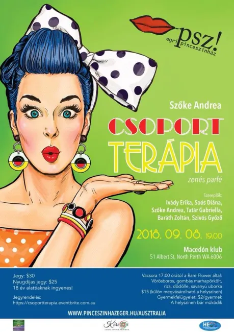 Most először Perthben a Pinceszínház Eger bemutatja a Csoportterápia című kortárs zenés vígjátékot - avagy „mjuzikelkámedit”! Ez egy vissza nem térő lehetőség a magyar közönségnek. A finom magyar vacsoráról a the Rare Flower fog gondoskodni.