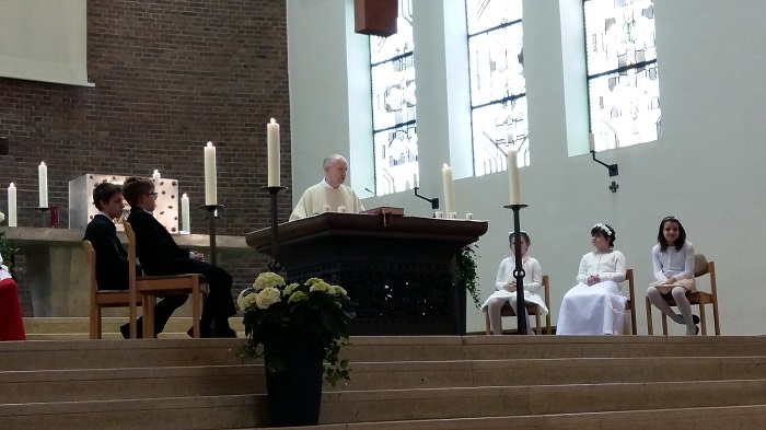 Idén május 7-én, vasárnap Düsseldorfban a 11:00 órakor kezdődő magyar szentmisén került sor a nagy eseményre. A mise előtt gyónással készítették elő lelküket az elsőáldozók, hogy tiszta szívvel részesülhessenek az Oltáriszentségben. Az ünnepi mise első felében a kisebbek gyerekkatekézisen vettek részt a sekrestyében, ahol az aktuális szentírási rész mentén Jézusról, a Jó Pásztorról beszélgettek, és készítettek bárány figurát. A misére visszatérve egy szép énekkel ajándékozták meg az elsőáldozókat, és a már szokássá vált módon végezték a rájuk bízott feladatot: kis csengőkkel csengettek a szertartás megfelelő részeinél.