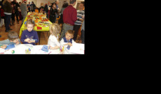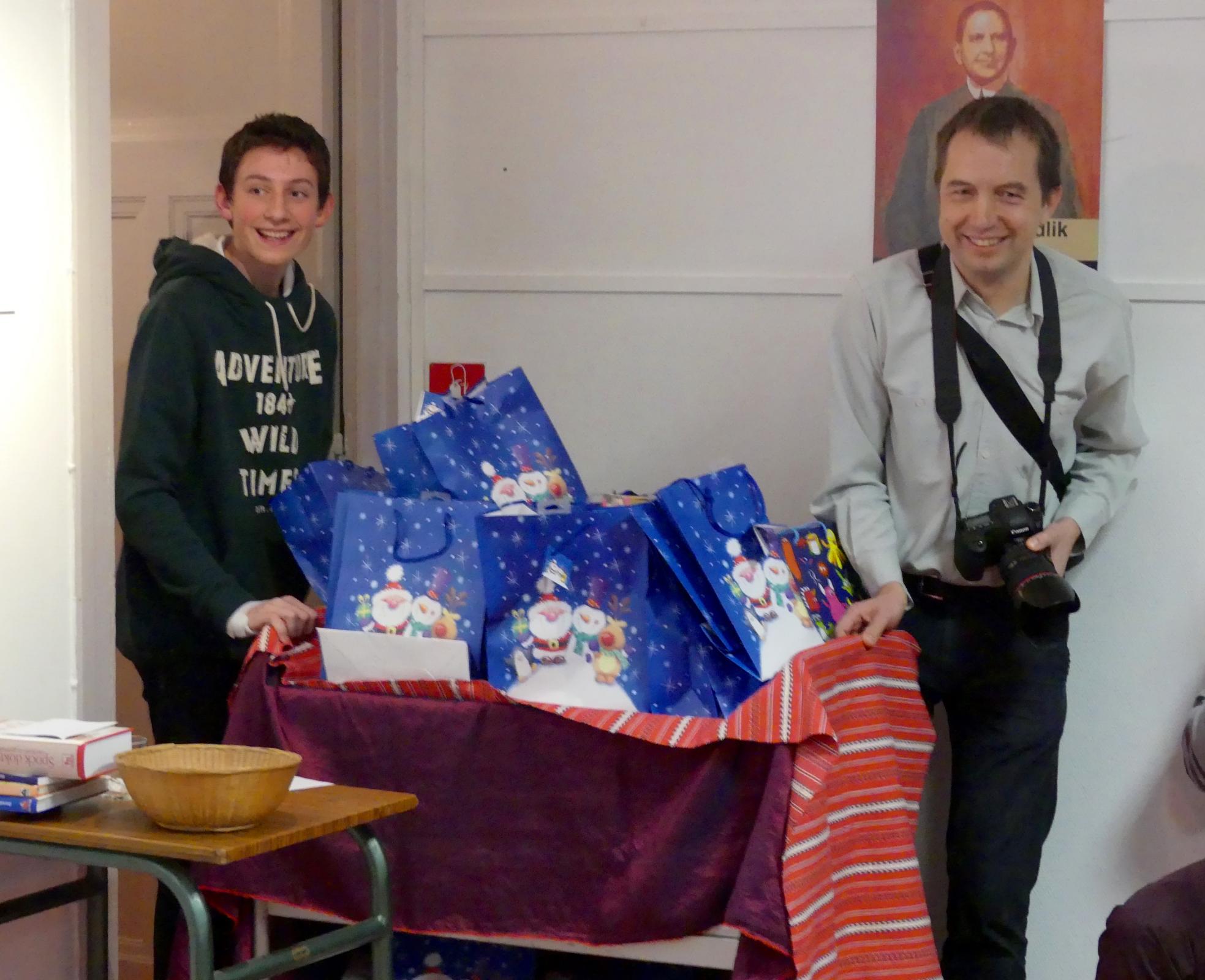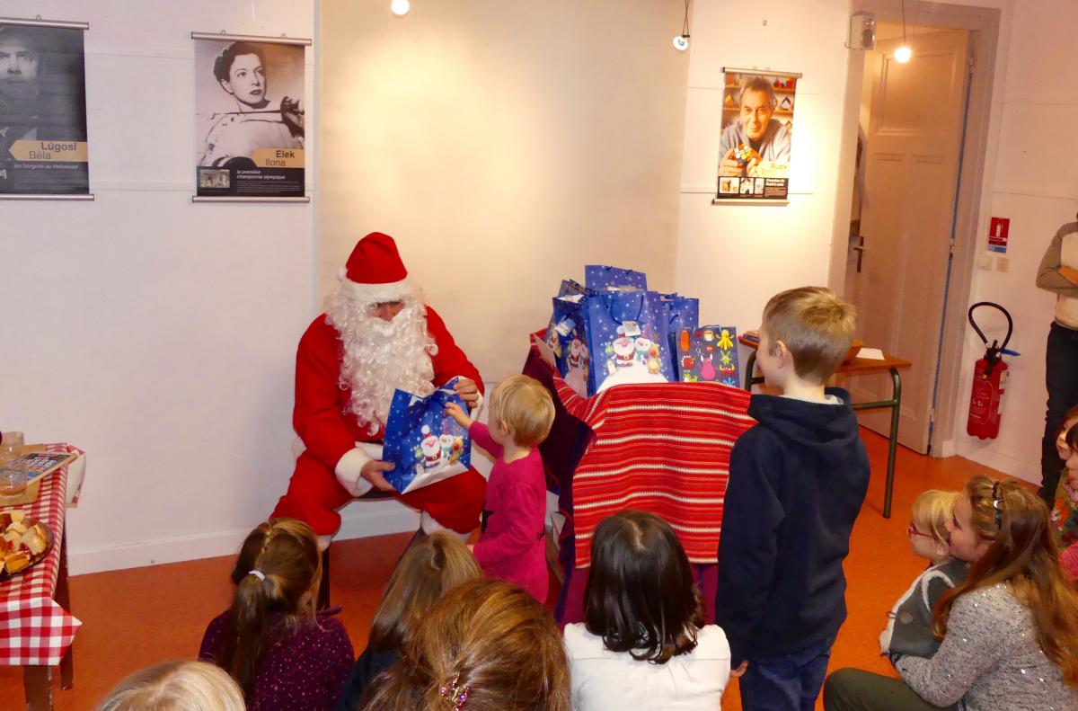 A szülők lelkesen sürögtek a gyerkekek körül, akik karácsonyi képeslapokat készítettek várakozás közben. A kreativitásuk nem ismert határt! Eközben a szülők a gazdagon megrakott büféasztal körül élvezték a hangulatot és szemlélték, milyen átéléssel készül egy-egy képeslap. Aztán mikor betoppant a Mikulás, előadtuk legjobb tudományunkat, a neki szánt énekeket és cserébe minden gyerek szép könyvből és édességből álló csomagot kapott. Külön dícséret illeti a Mikulást pedagógiai érzéke miatt: minden gyerekhez szólt néhány szót (a szülőktől előzetesen kapott háttérinfo alapján), milyen jó, hogy megeszi a zöldégeket, csak jövőre is legyen ilyen ügyes, vagy hogy bizony-bizony azt hallotta, nem mindig bánik szépen a testvérkéjével adott kisgyerek. Ilyenkor megszeppenve, ajándékot magához szorítva sietett vissza mindenki a szüleihez…„Dehát honnan tudja?!" Elbúcsúztatva a Mikulást, megköszönve a sok szép csomagot, eltüntettük a büféasztal finomságait és hogy ledolgozzuk a sok süteményt, egy hirtelen ötlettől vezérelve táncra perdültünk. Volt néhány francia család is a díszes társaságban, nekik különösen nagy émény volt a magyar néptáncelemek elsajátítása. Szülők és gyerekek, együtt ropták fáradhatatlanul. Mikor a maradék édesség is elfogyott, útjára indult a sok apróság, csillogó szemekkel, teli kezecskékkek. Vitték a Mikulástól kapott ajándékot, a saját készítésű késelapot és a szép emlékekeket!