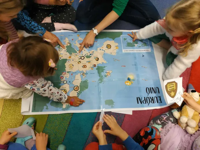 Az ovisok először arról beszélgettek, hogy Anglián kívül járt-e valaki más országban? Ha igen, akkor melyik országban? Hogyan érezték ott magukat? Mások voltak-e ott az emberek? Mi mindent láttak másnak, mint Angliában? Majd Fenge Ágnes tanító néni egy Európa(i Uniós) térképet helyezett a szőnyegre, ahol az országokhoz rendelt kis képecskék alapján magyarázta el a gyerekeknek, melyik ország nemzete miről híres. Ezt követően többek között az olasz pizza, a holland sajt, a német perec mellett a magyar túrórudi is terítékre került a szó konkrét értelmében, és a gyerekek nagy örömére. Előkerültek még különböző, az egyes országokra jellemző színezők, mint pl. a jellegzetes holland szélmalom. A sok új és érdekes információ okozta fáradtságot megelőzendő, egyedileg gyártott dobókockával gurították ki az ovisok azt a mozgássort, ami kicsit felpezsdítette a hangulatot az óra folytatásához. Volt malom körzés, biciklizés háton fekve, körben futkározás, és egymás kezének megfogása az összetartozás jeleként.
