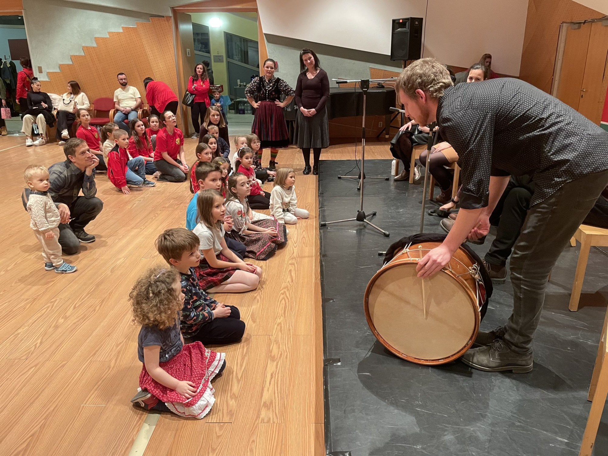 A késő délután a gyerekek táncházával kezdődött: moldvai táncokat tanítottunk nekik, miközben a zenekar bemutatta a Moldvában használt hangszereket. A gyerekek érdeklődve figyelték a zenészeket, majd nagy örömmel táncoltak. Ezek a táncok játékosak és vidámak, így kicsik és nagyok egyaránt élvezték!
