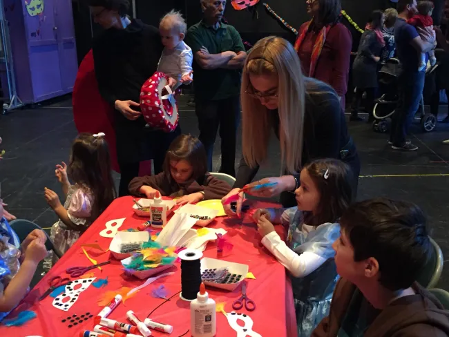A mostani farsangi mulatságra való felhívást sokan olyan komolyan vették, hogy többen még a szülők közül is jelmezben érkeztek. Aki pedig nem hozott álarcot magával, rögtön le is ülhetett a kézműves asztalokhoz, ahol farsangi tányérálarcot, hagyományos farsangi maszkot, valamint a hungarikumnak is minősitett busójárást felelevenítve, busóálarcot készíthettek. Aki megéhezett közben, az magyar süteményeket kóstolhatott, hiszen a játszóház tagjai mindig figyelnek arra, hogy rendezvényeiken finomabbnál finomabb sütemények kerüljenek az asztalra. Így most is nehéz volt választani a zserbó, a sajtos pogácsa, az almáspite és az ilyenkor elmaradhatatlan farsangi fánk közül.