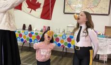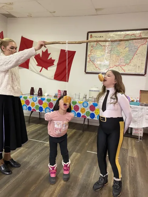 A hónap másik kiemelkedő eseménye a Magyar házban megrendezett farsangi ünnepség volt, amely elsősorban a gyerekek számára kínált tartalmas és élményekben gazdag programot. A rendezvény során a gyerekek kézműves foglalkozáson vehettek részt, ahol farsangi maszkokat díszítettek, valamint népi gyermek játékokat és különböző ügyességi játékokat sajátíthatják el. A foglalkozások célja az volt hogy játékos formában kapcsolódjanak a magyar népi hagyományokhoz, miközben közösségi élményt is szereznek. A program részeként jelmezversenyre is sor került, amelyet a közösség nagy tapssal és lelkesedéssel fogadott. A gyerekek rendkívül kreatív és ötletes jelmezekben érkeztek, ami tovább emelte az esemény hangulatát. A farsangi hagyományok bemutatására is hangsúlyt fektettünk: a gyerekek megismerkedhettek a busóálarccal, amelyet fel is próbálhattak, így a testközelből tapasztalhatták meg a magyar népszokások egyik jellegzetes elemét. A nap természetesen nem telhetett el farsangi fánk nélkül sem, amely közös elfogyasztása tovább erősítette az ünnepi hangulatot. A csapatjátékok különösen nagy sikert arattak. A gyerekek többek között tojásvivésben (kiskanálban egyensúlyozva), "mocsárjárásban" valamint ügyességi fánkevésben mérhették össze tudásukat. Utóbbi során a fánkok egy botra voltak felkötve, és a résztvevőknek hátrakötött kézzel kellett elfogyasztaniuk azokat. A játékos versengés során pontokat gyűjtöttek, ami még él izgalmasabbá tette a programot.