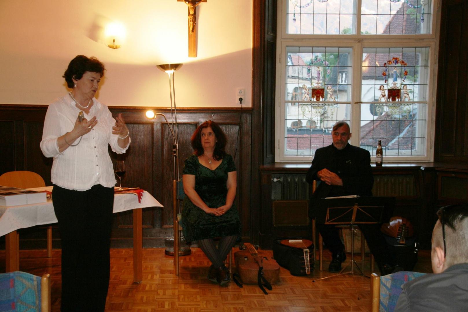 Fehérváry Lillát és Kátai Zoltánt május 5-én, pénteken este az innsbrucki Magyar Diákotthon és Kultúrcentrumban – ismertebb nevén: Magyar Házban – a szokásos klubest keretében is köszönthettük. Jelen volt Nagy Frigyes, az Innsbrucki Magyar Egyetemisták és Akadémikusok Szövetségének (IMEASZ) elnöke, Szabados Péter, a Magyar Diákotthon és Kultúrközpont Egyesület elnöke, Hanák Beatrix, az IMEASZ pénztárosa és a magyar szentmisék liturgiafelelőse, Nagy-György Attila Dél-Tirolból az innsbrucki katolikusokat is ellátó lelkész, a programok előkészítésében sokat segítő Schenk Angyalka, a 79. sz. Dr. Kozma György SJ Cserkészcsapat, a NeveNincs Csoport, az Innsbrucki Magyar Irodalmi és Népdalkör, valamint az Innsbrucki Magyar Hölgyek Csoportjának a vezetője. Velünk tartott több cserkészcsalád is, köztük Csonkáné Simon Ildikó és Orosz Gabriella cserkészanyukák. A 13 éves Horváth Bence cserkész ott volt a délutáni rendhagyó irodalomórán is, és annyira tetszett neki, hogy elhívta édesanyját, Horváthné Vajdics Mariannt, és kisöccsét, Horváth Bertold Botondot az esti előadásra is. Mayrhofen-ből Nagy Katalin, a wörgl-i magyar kisdiákokat oktató pedagógus is eljött párjával, Szentgyörgyhegyi Ferenccel – és csatlakoztak hozzánk még sokan mások is. Nagy Frigyes megnyitószavai után a díszteremben vallásos énekek, vidám, a közönséget is bevonó bordalok és lelkesítő katonadalok is felcsendültek, és természetesen itt is hallhattunk többet a magyar költészet gyöngyszemeiből. A fényes nap immár lenyugodott című esti ima Kátai Zoltán előadásában csodálatos befejezése volt az estnek, bár mi tagadás, a két művészt szívesen hallgattuk volna még körülbelül hajnalig. Legvégül Petőfi- és Kőrösi-ösztöndíjasként Balogh József Mit kívánok című versével búcsúztam el a tiroli magyaroktól, majd minden jelenlévőnek átadtam a Kaláka-Club 2017-es évkönyvét, amelyben a tavalyi ausztriai magyar rendezvényekről szóló beszámolók között több innsbrucki is szerepel. A műsor után Nagy Frigyes azt emelte ki, hogy nem lehetett távolságot érezni a zenészek és a közönség között. A művészek közvetlensége mellett bizonyára a publikum megénekeltetése tette, hogy úgy érezhettük, magunk is részesei vagyunk a pódiumon történteknek.